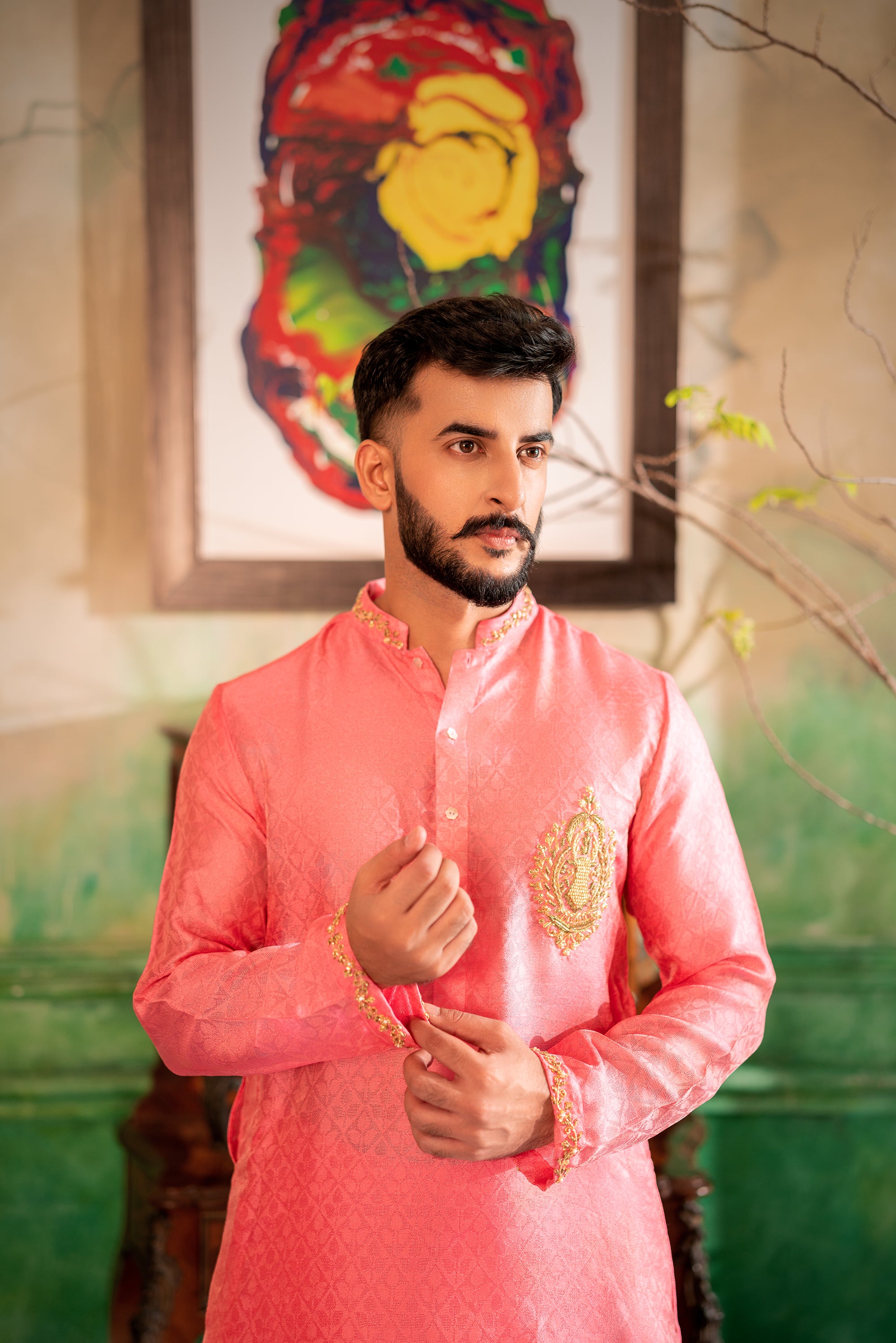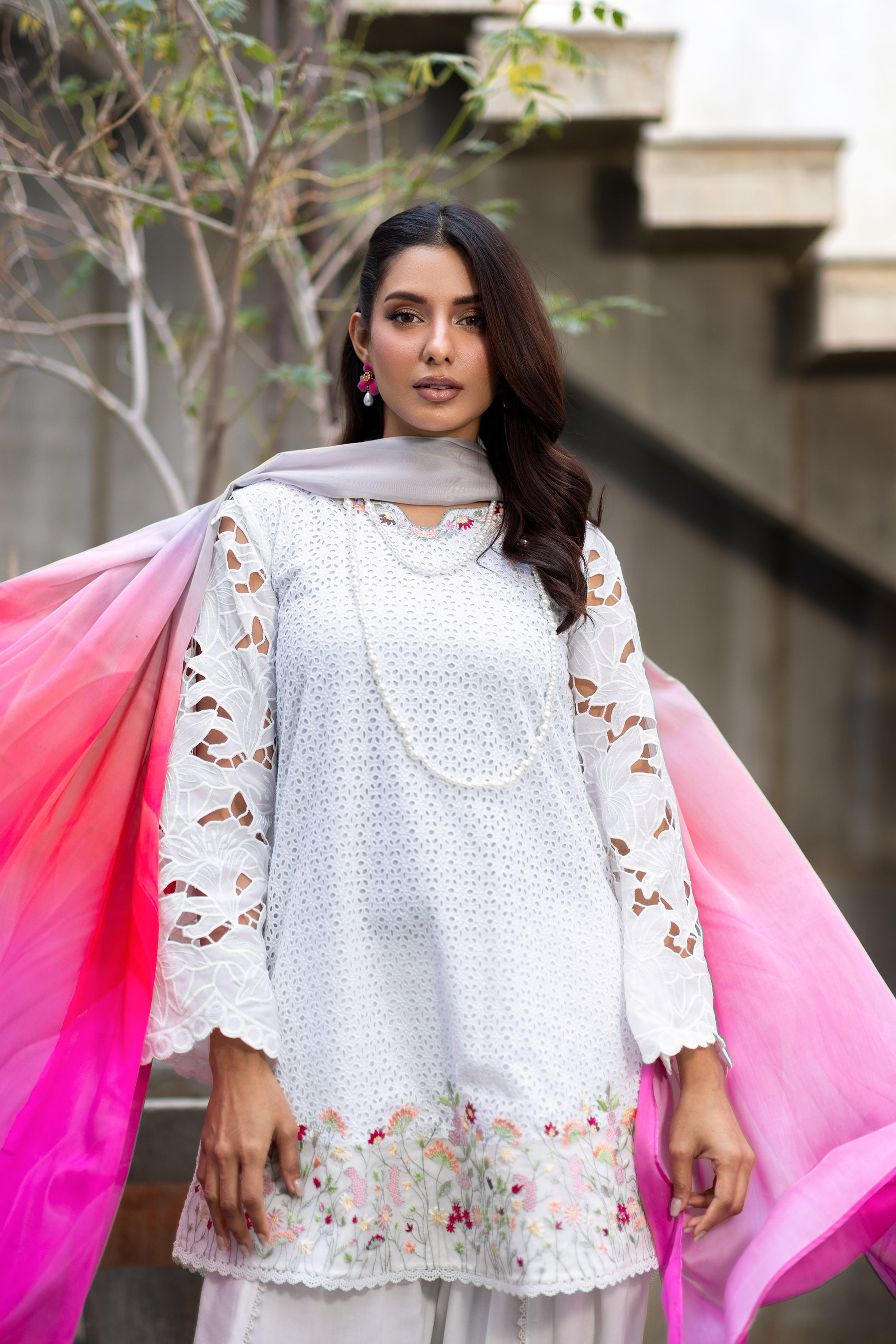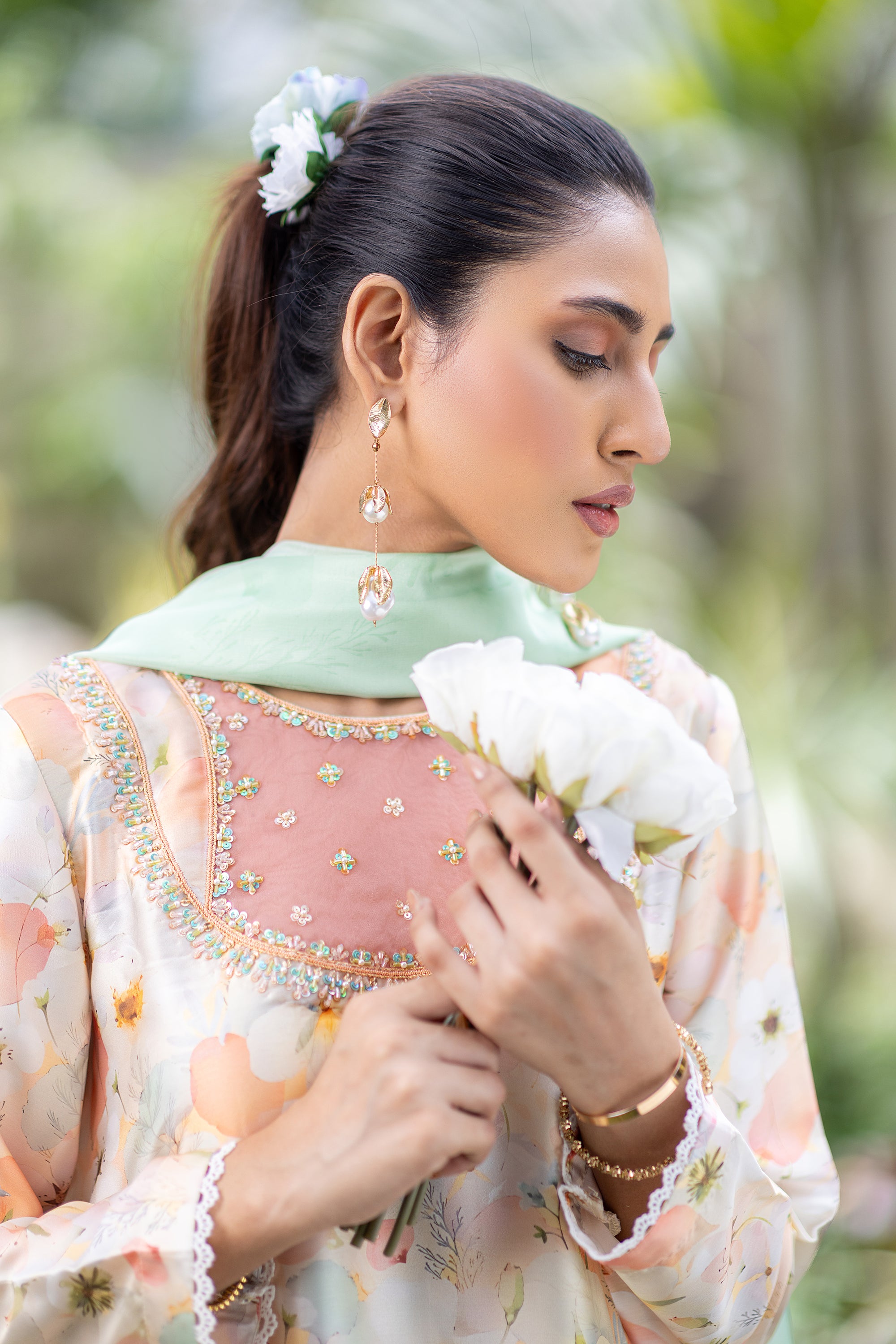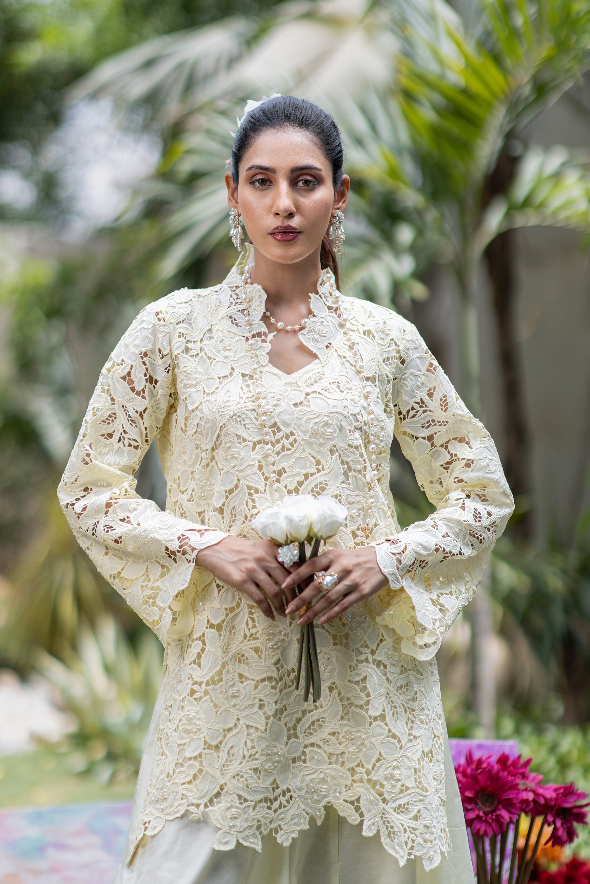An embroidered baby pink shirt with crochet sleeves and pearl details for a soft and graceful look.