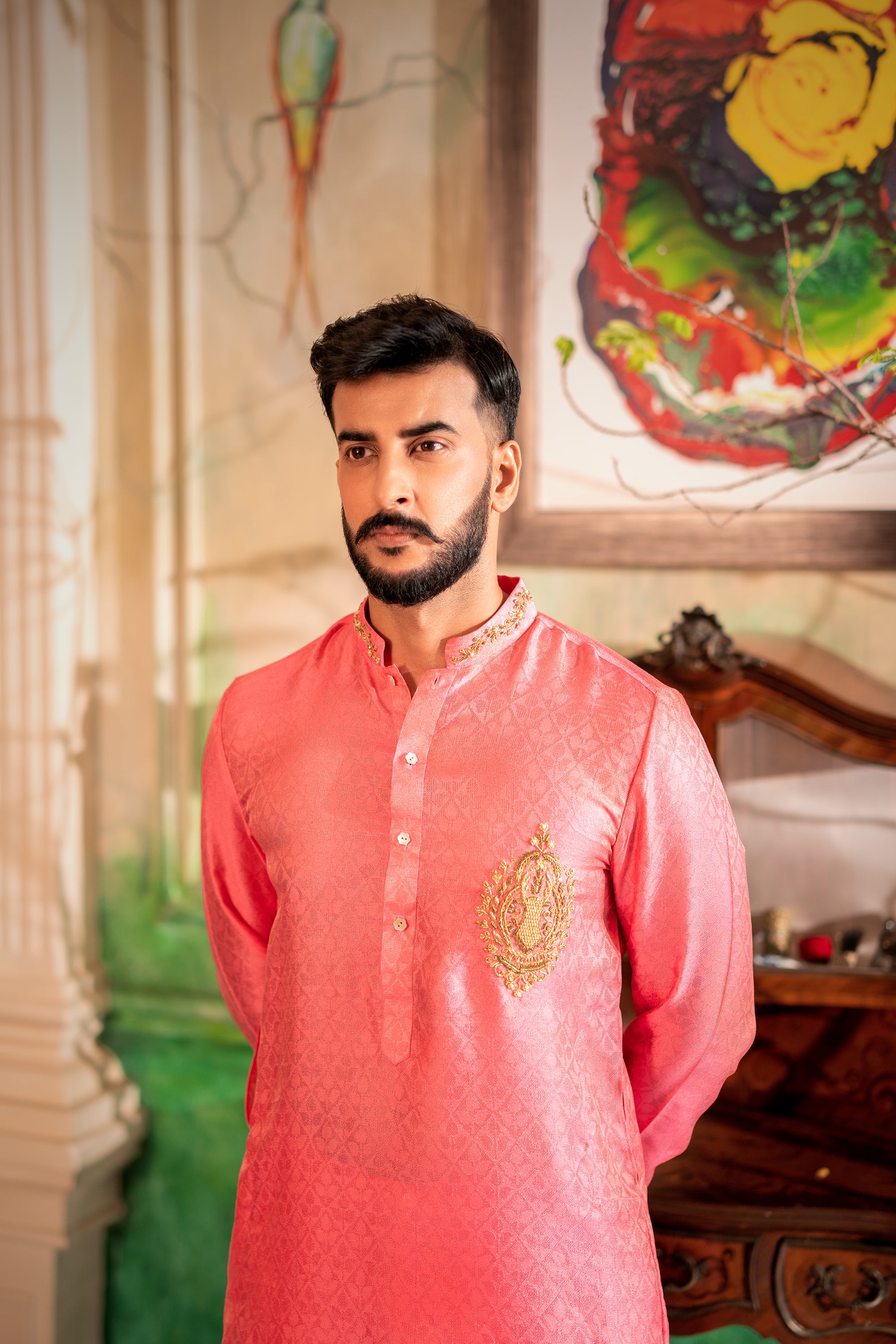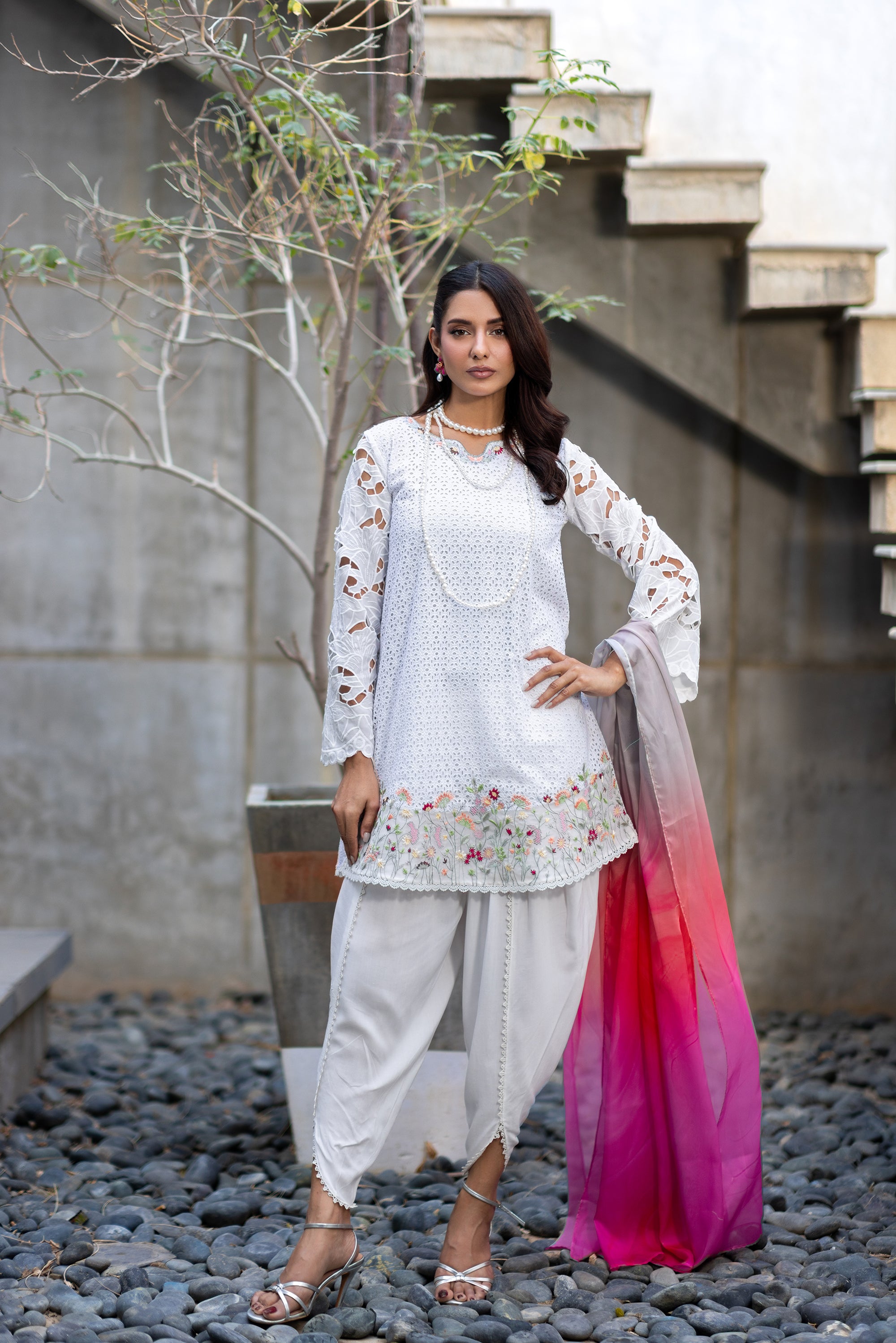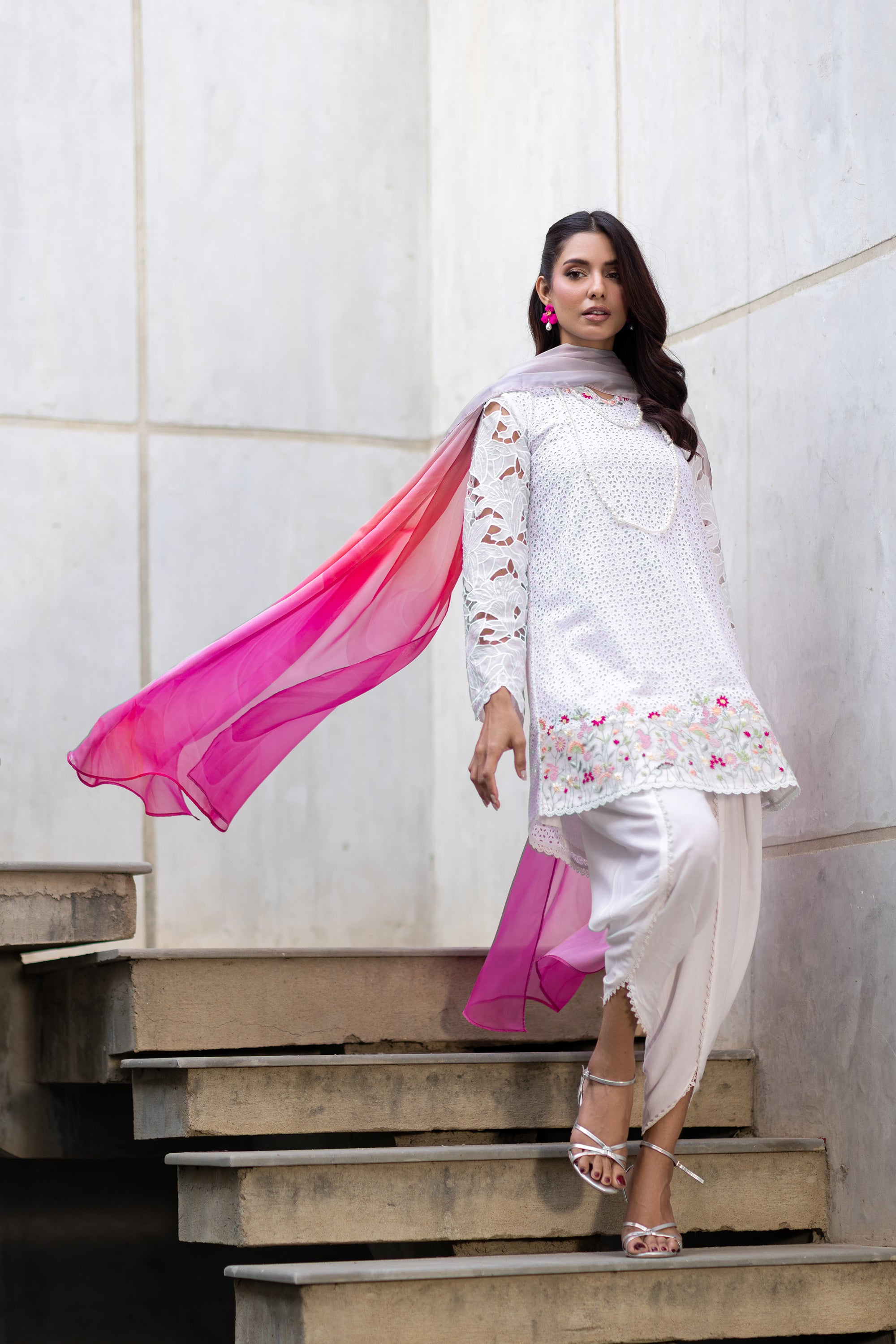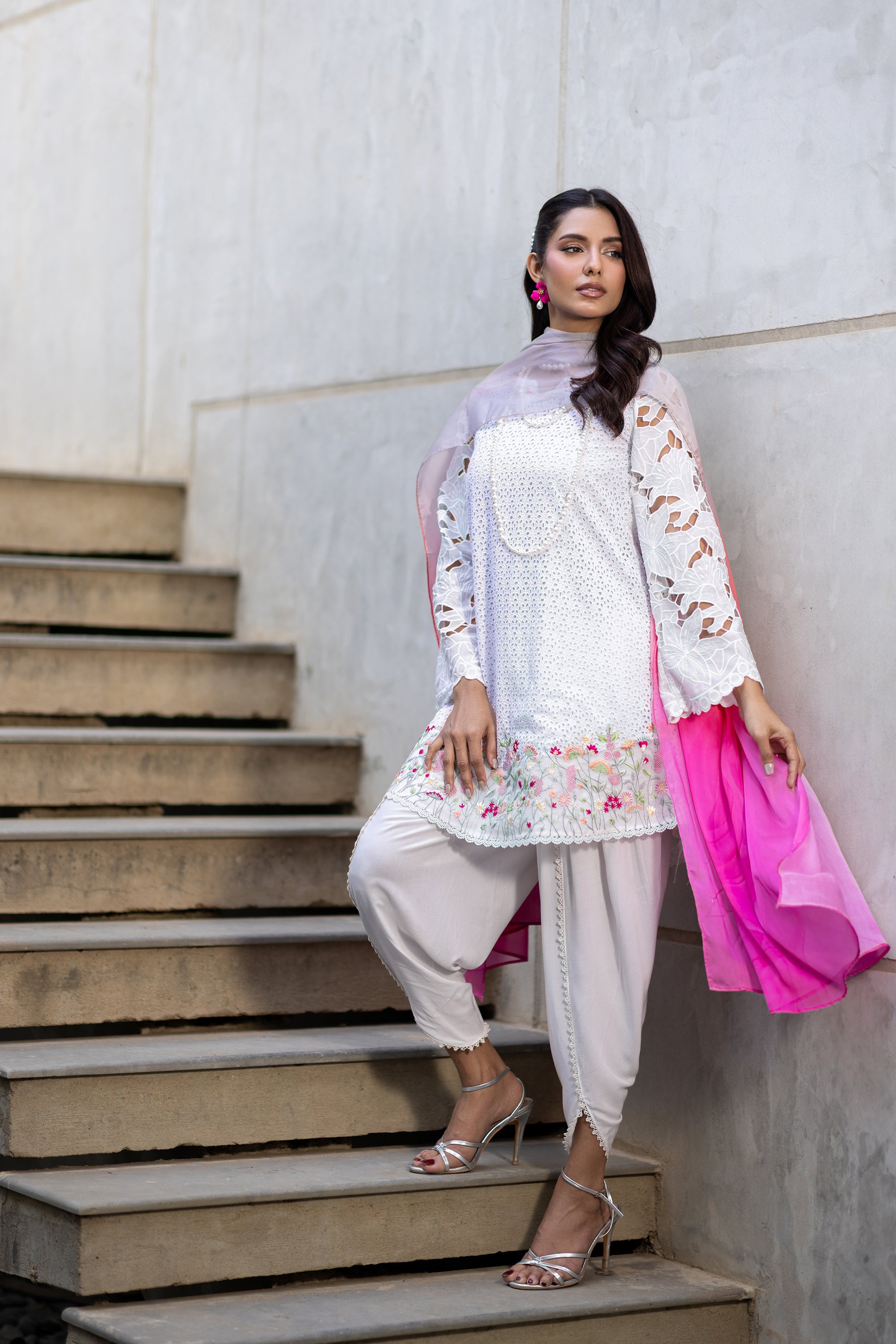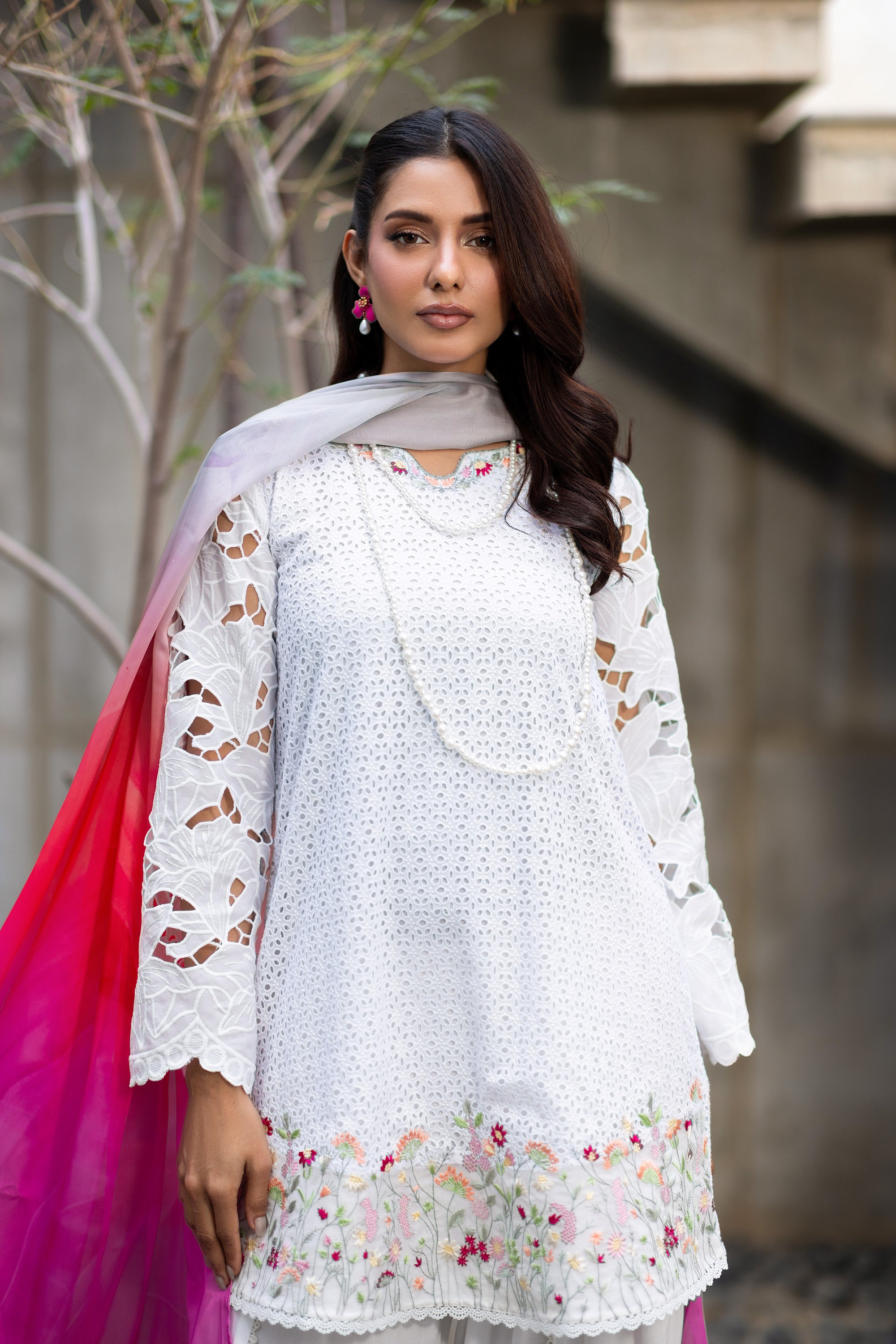 An embroidered baby pink shirt with crochet sleeves and pearl details for a soft and graceful look.