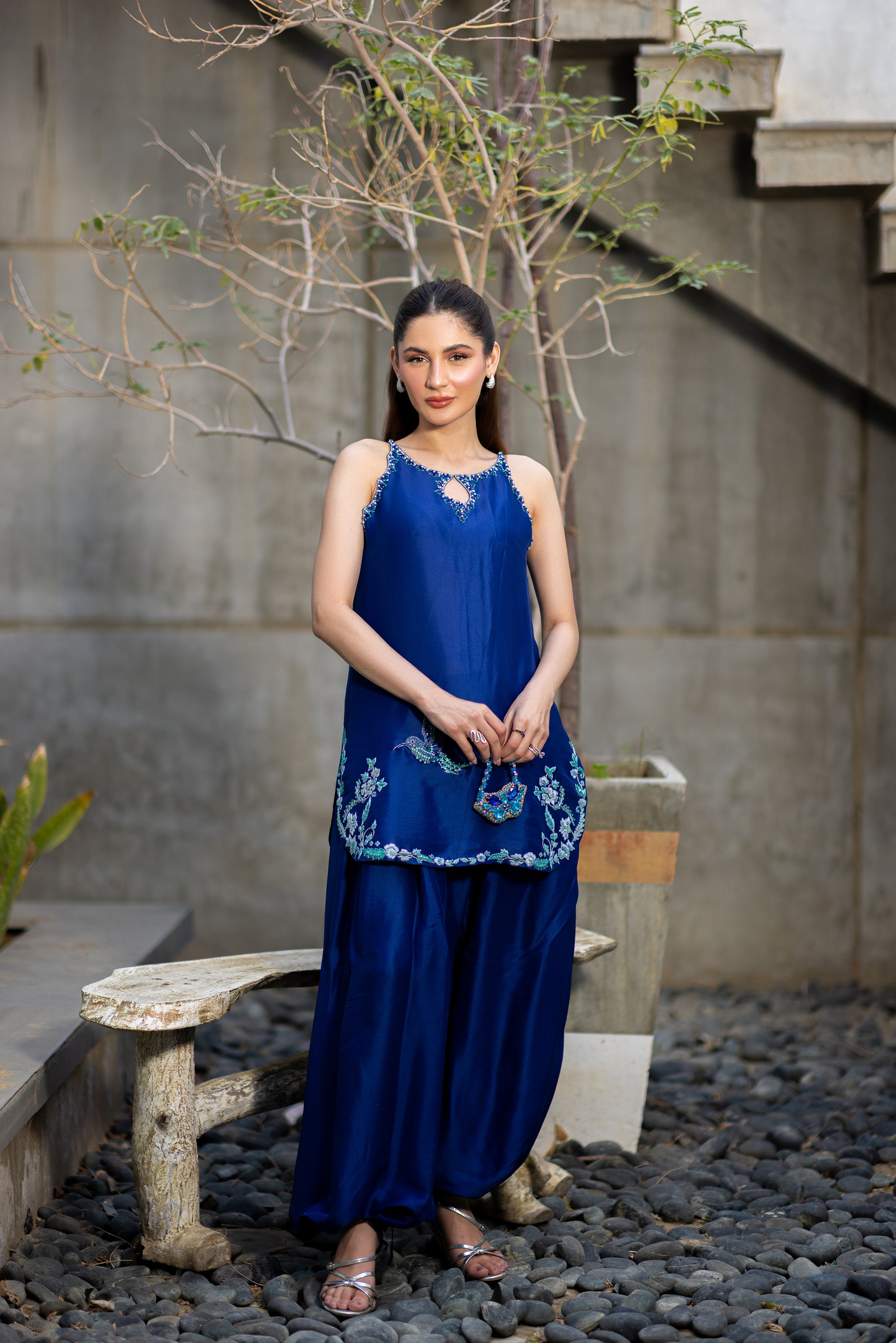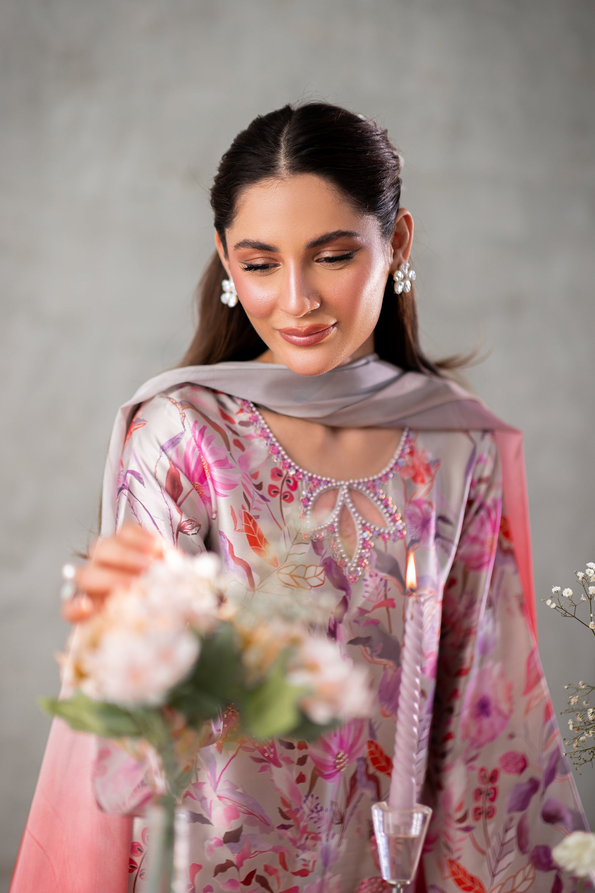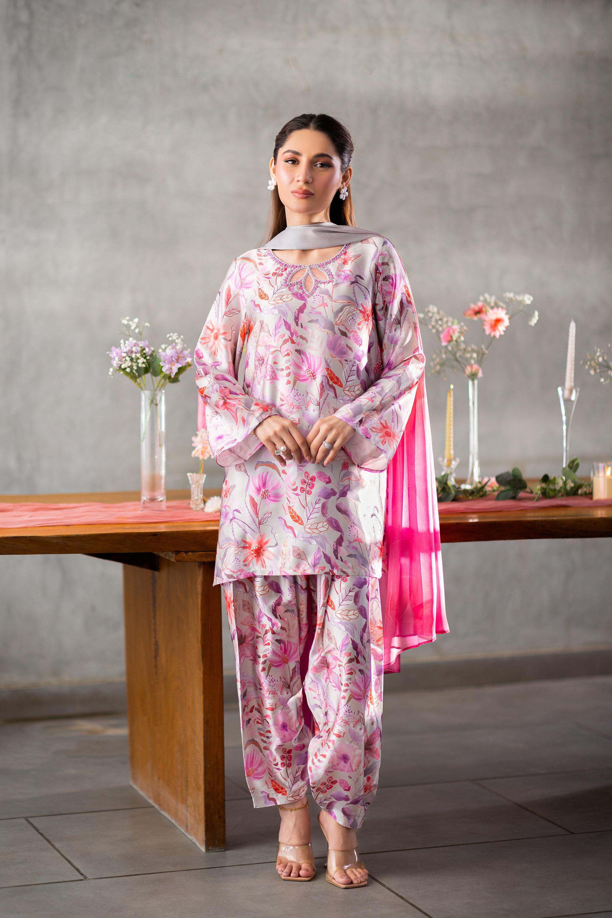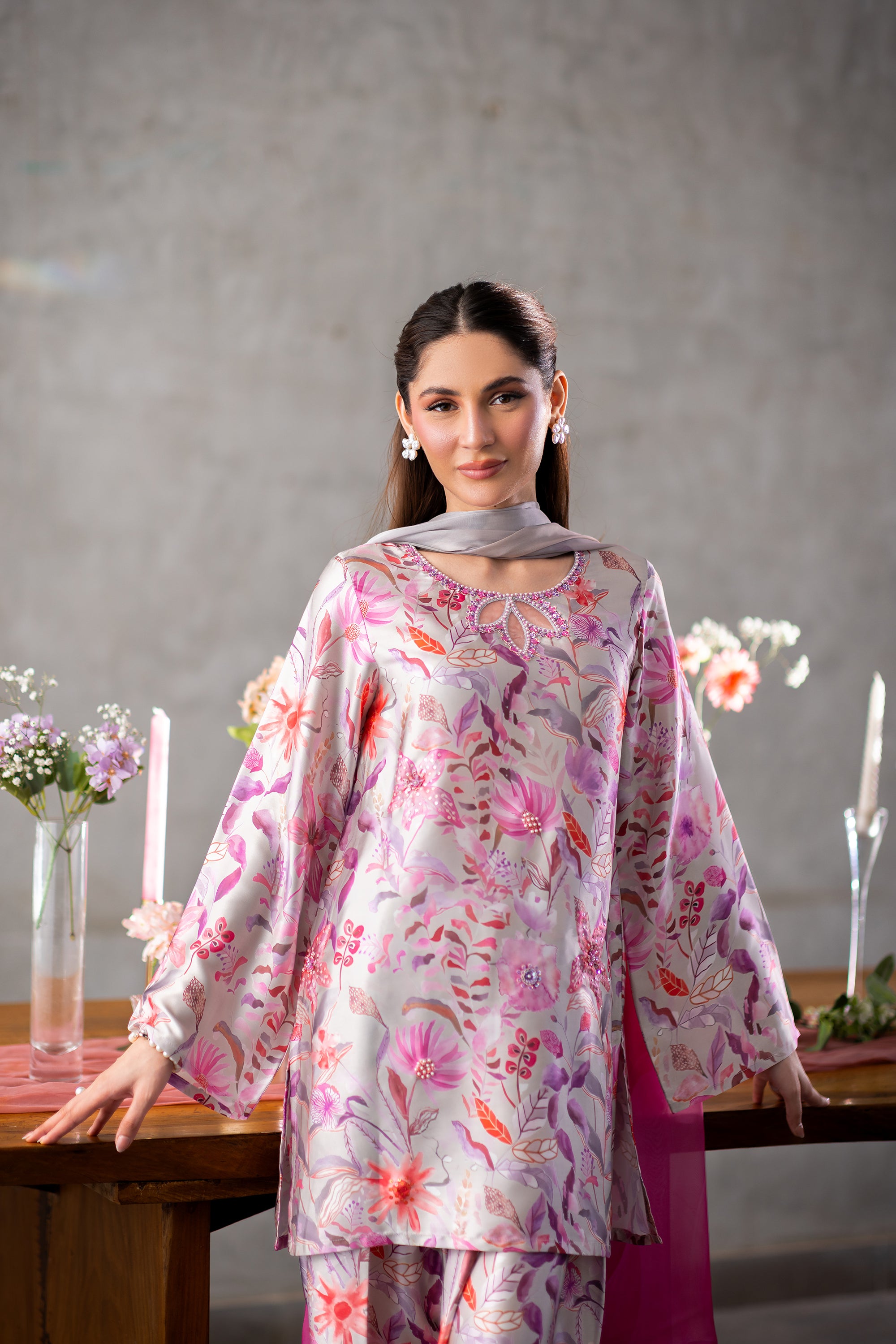 An embroidered baby pink shirt with crochet sleeves and pearl details for a soft and graceful look.