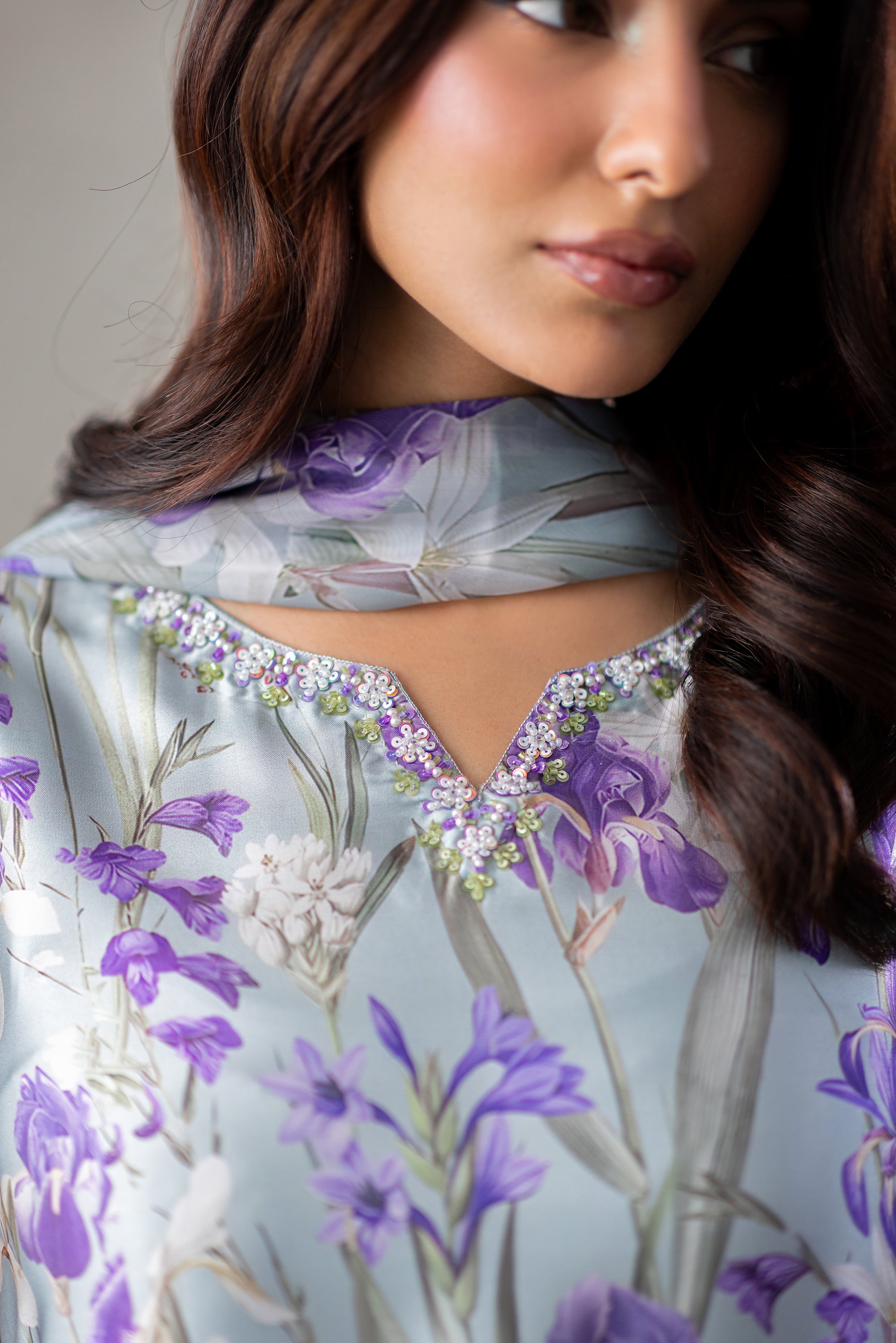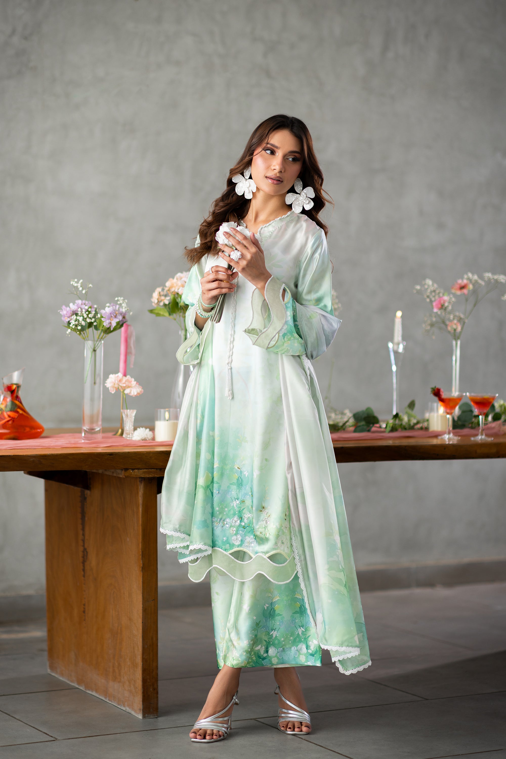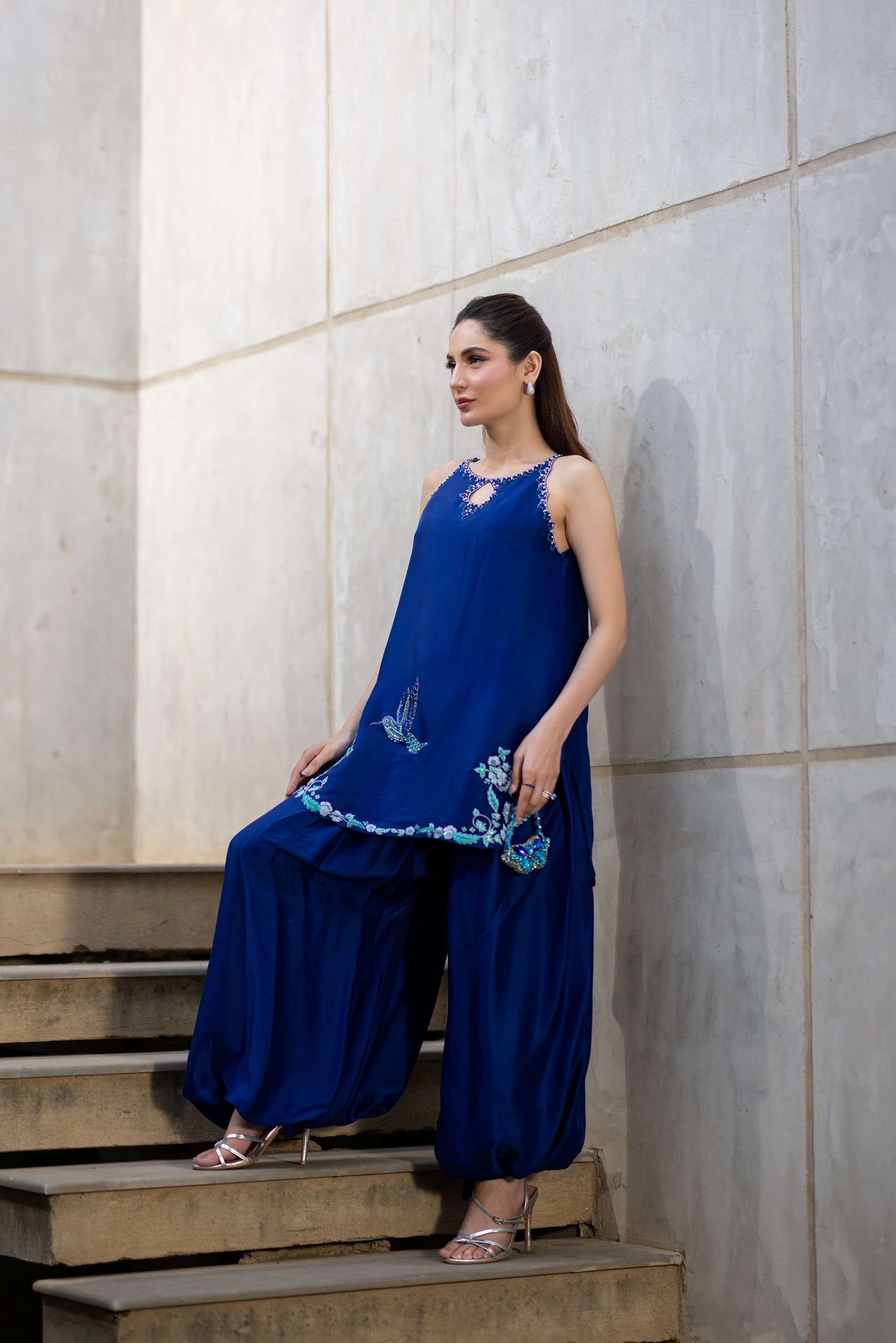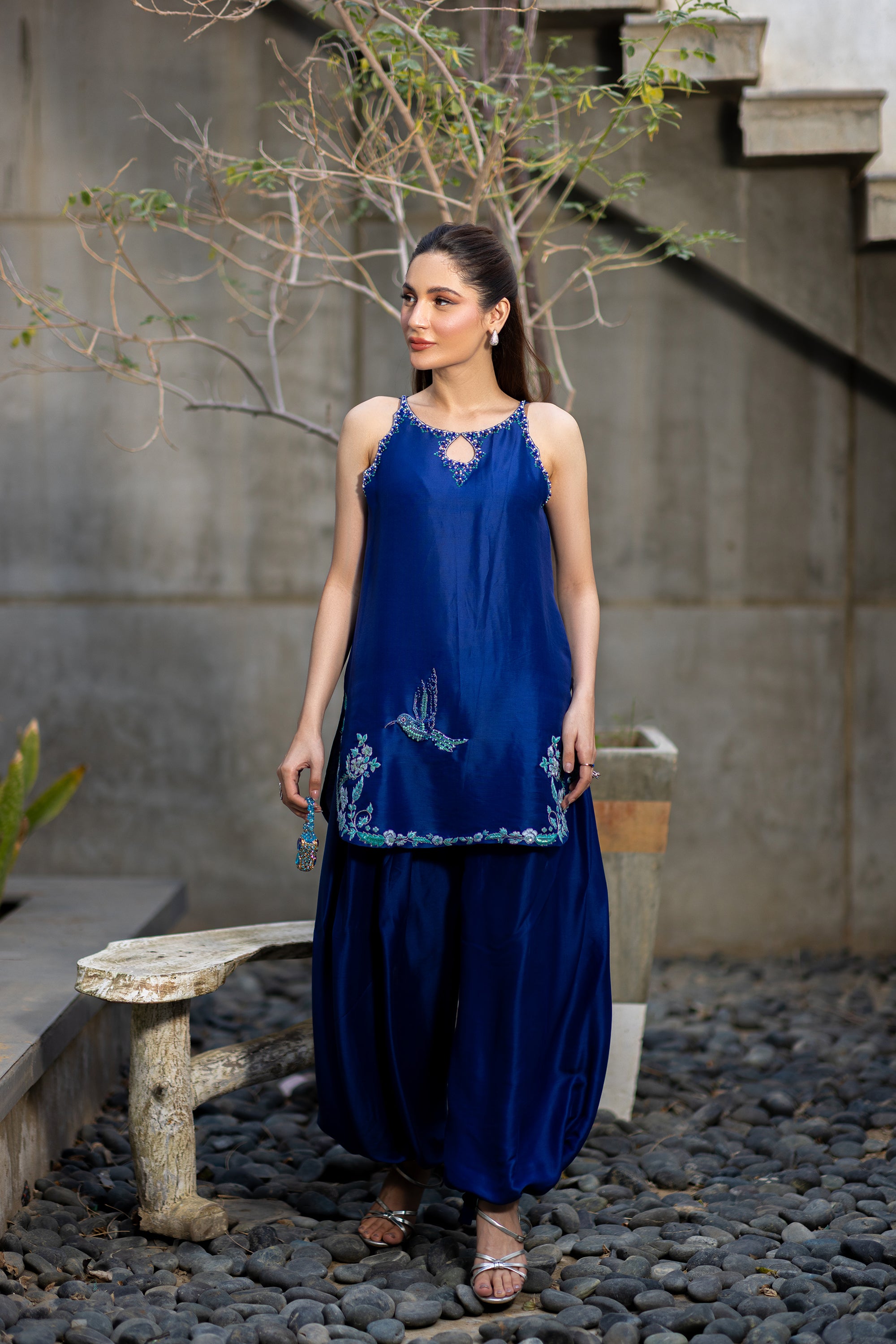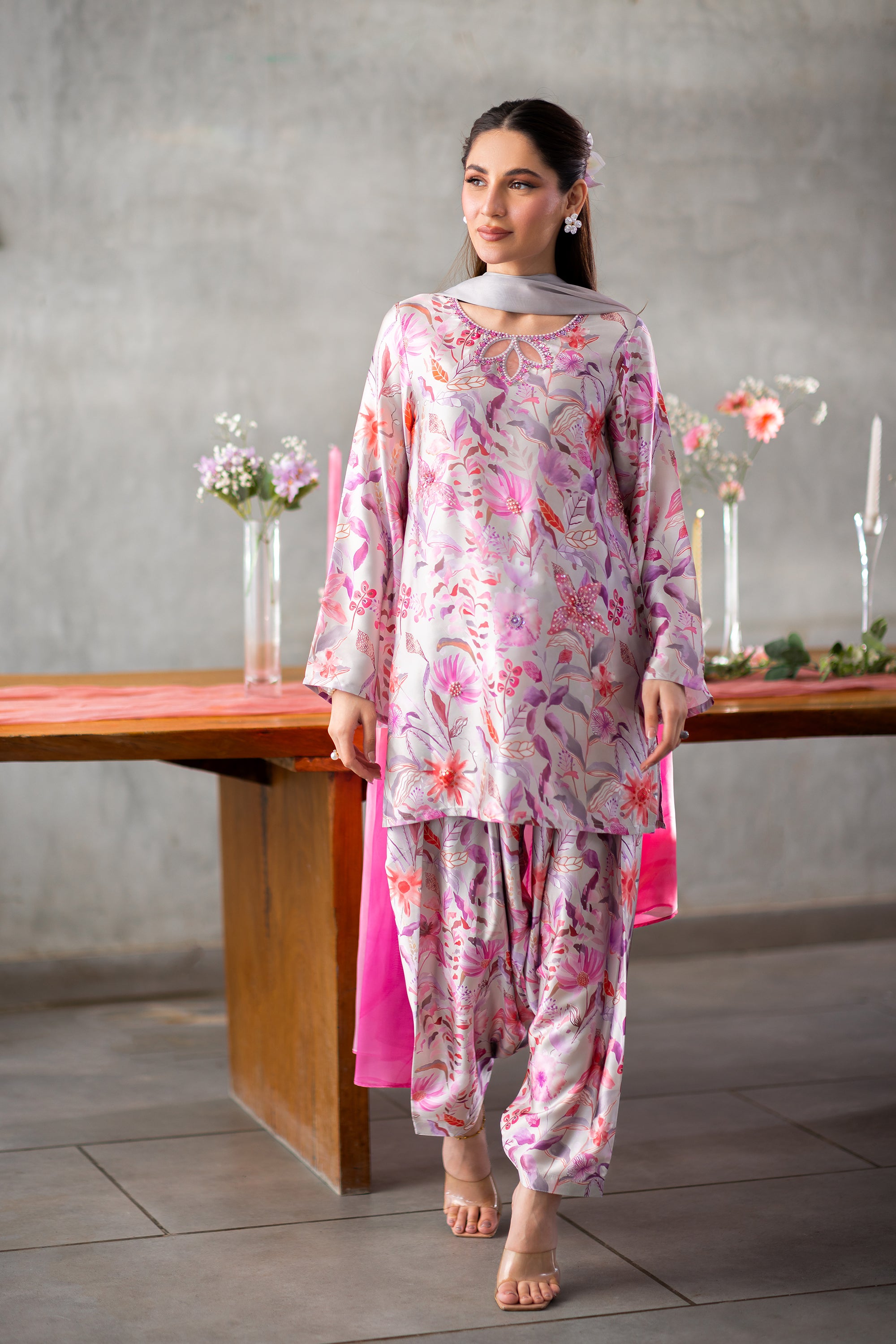 An embroidered baby pink shirt with crochet sleeves and pearl details for a soft and graceful look.