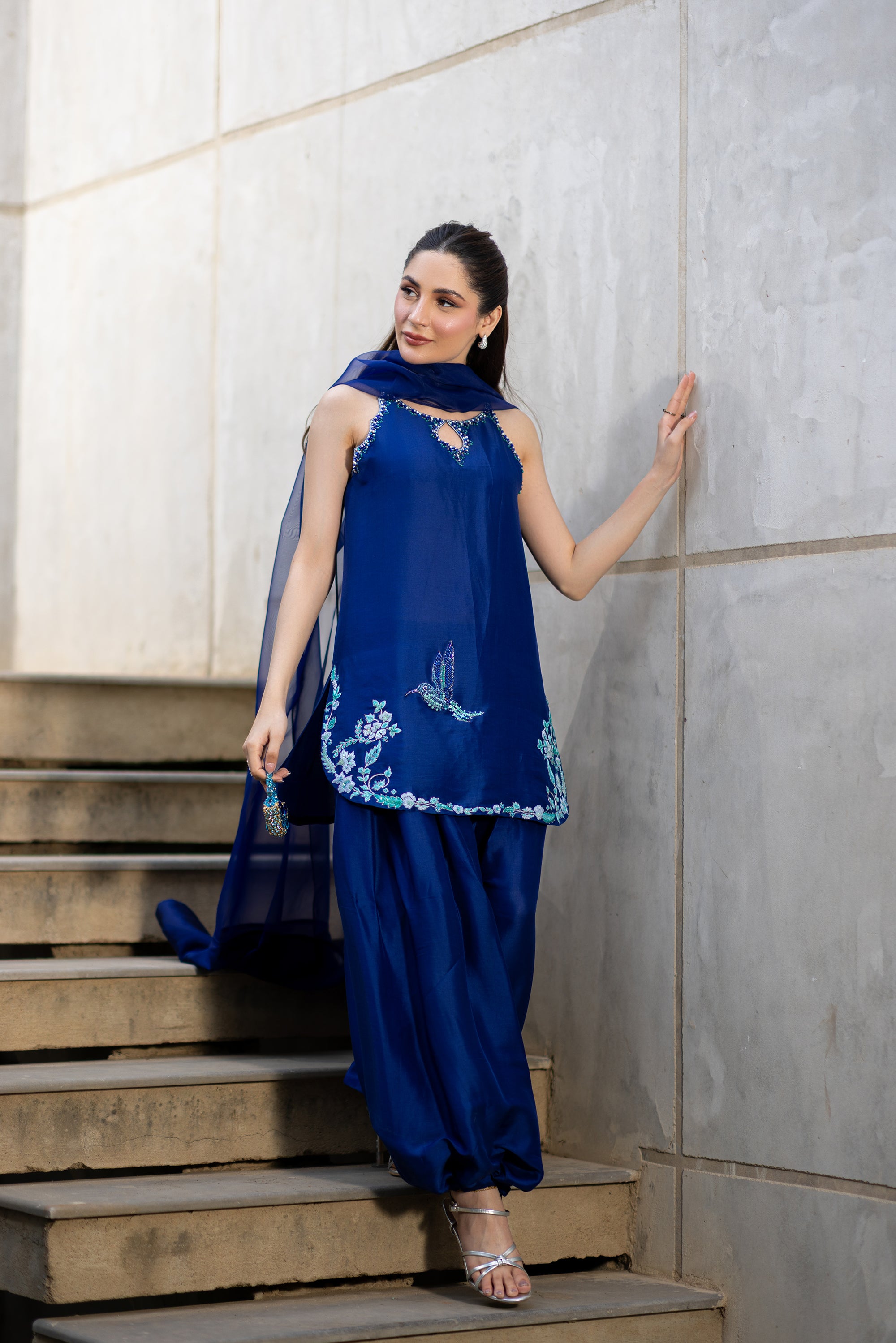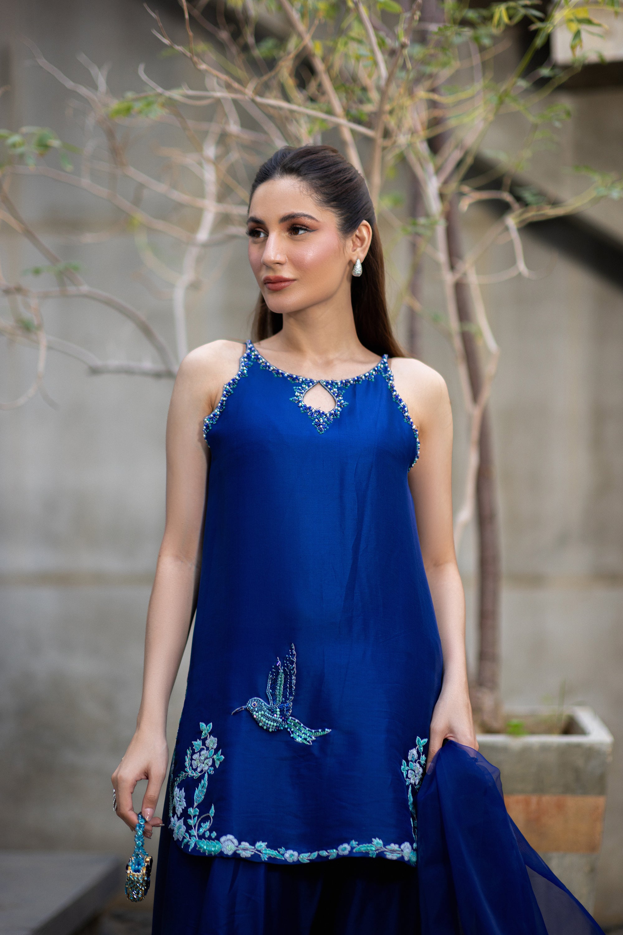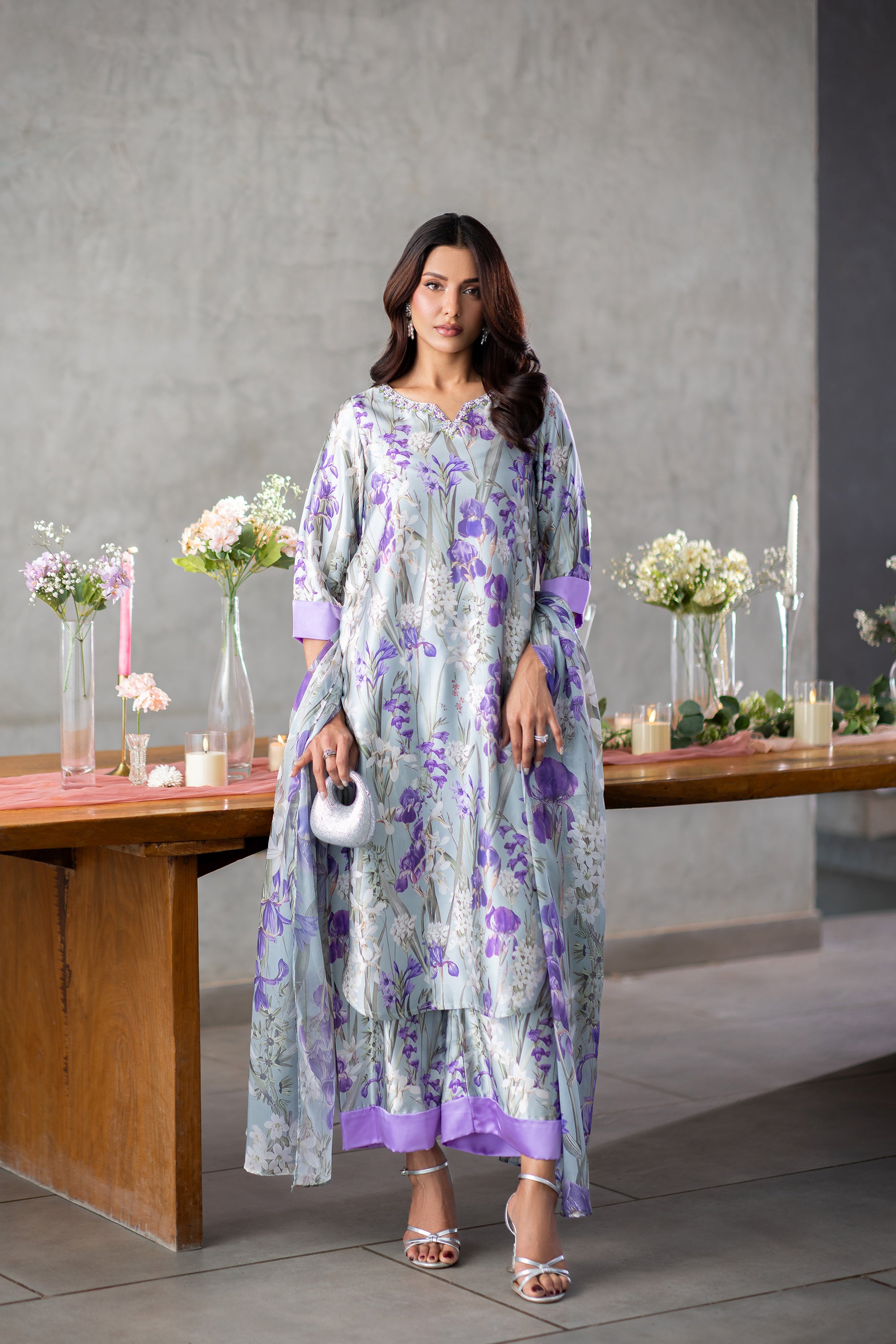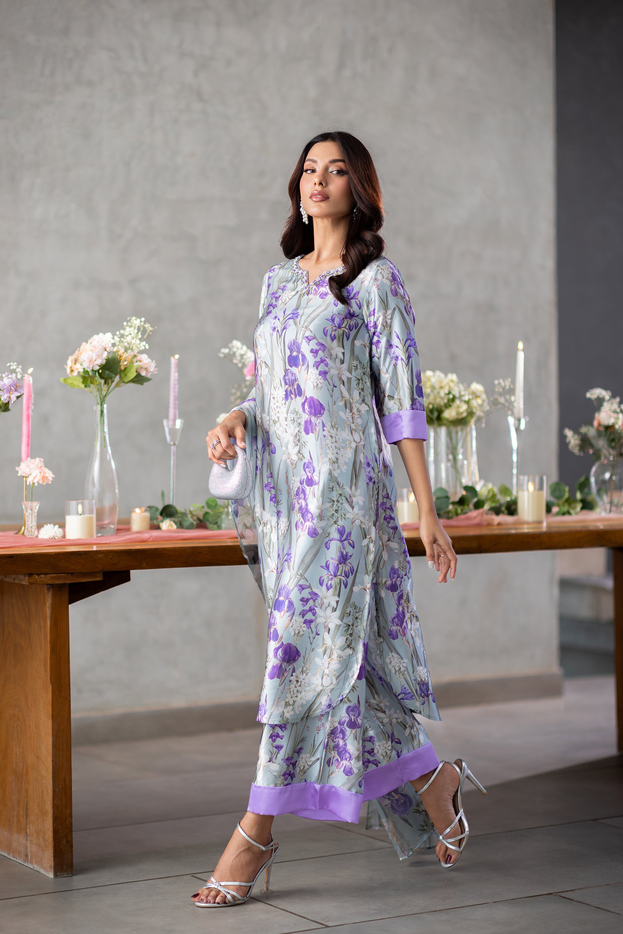 An embroidered baby pink shirt with crochet sleeves and pearl details for a soft and graceful look.
