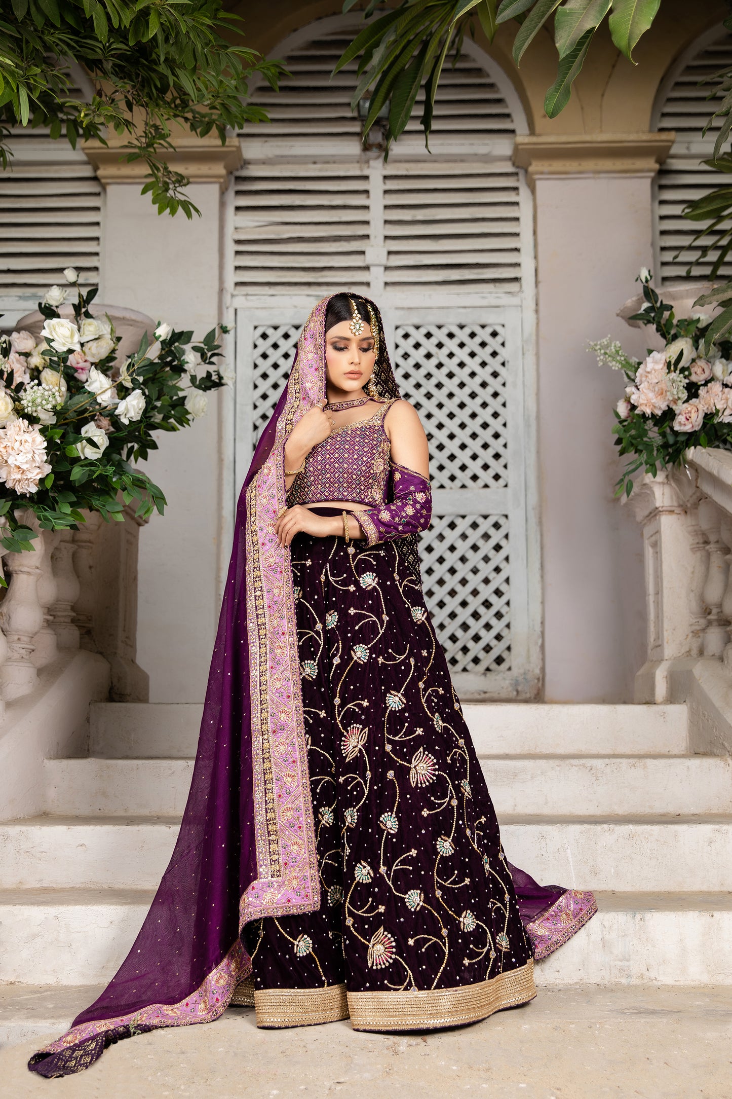 Elevate your bridal wardrobe with our exquisite Plum Velvet Lehnga Choli, a stunning ensemble designed for the modern bride who cherishes tradition with a touch of opulence. This intricately crafted lehnga choli is a perfect choice for pre-wedding festivities, particularly a Mehndi ceremony, where its rich hues and detailed craftsmanship will ensure you stand out.