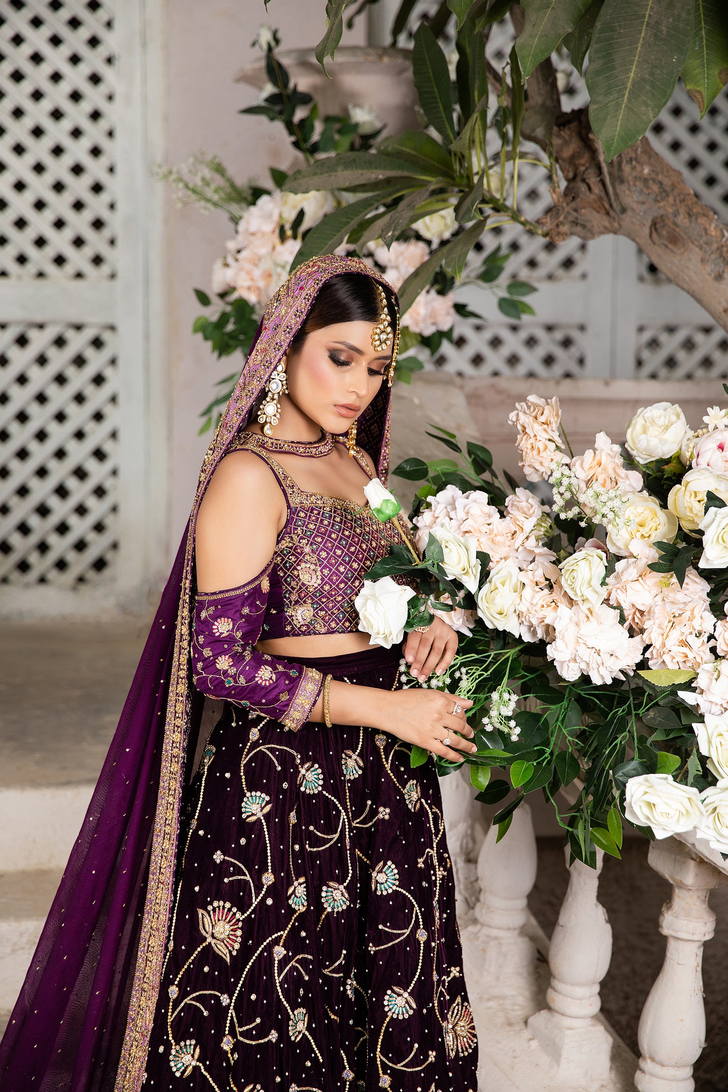 This lehnga choli is made from luxurious plum velvet, a fabric known for its softness, rich color, and elegant drape. The deep plum shade not only adds a regal touch but also complements a wide range of skin tones, making it an ideal choice for your special day.