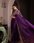 Discover elegance and timeless allure with our Plum Damaan Outfit, meticulously crafted to elevate your traditional wardrobe. Adorned with intricate dabka embellishments, the daaman glimmers with opulence, creating a captivating play of light and texture. The sleeves border and bootian detailing throughout add a touch of artisanal craftsmanship, ensuring every stitch tells a story of heritage and sophistication.