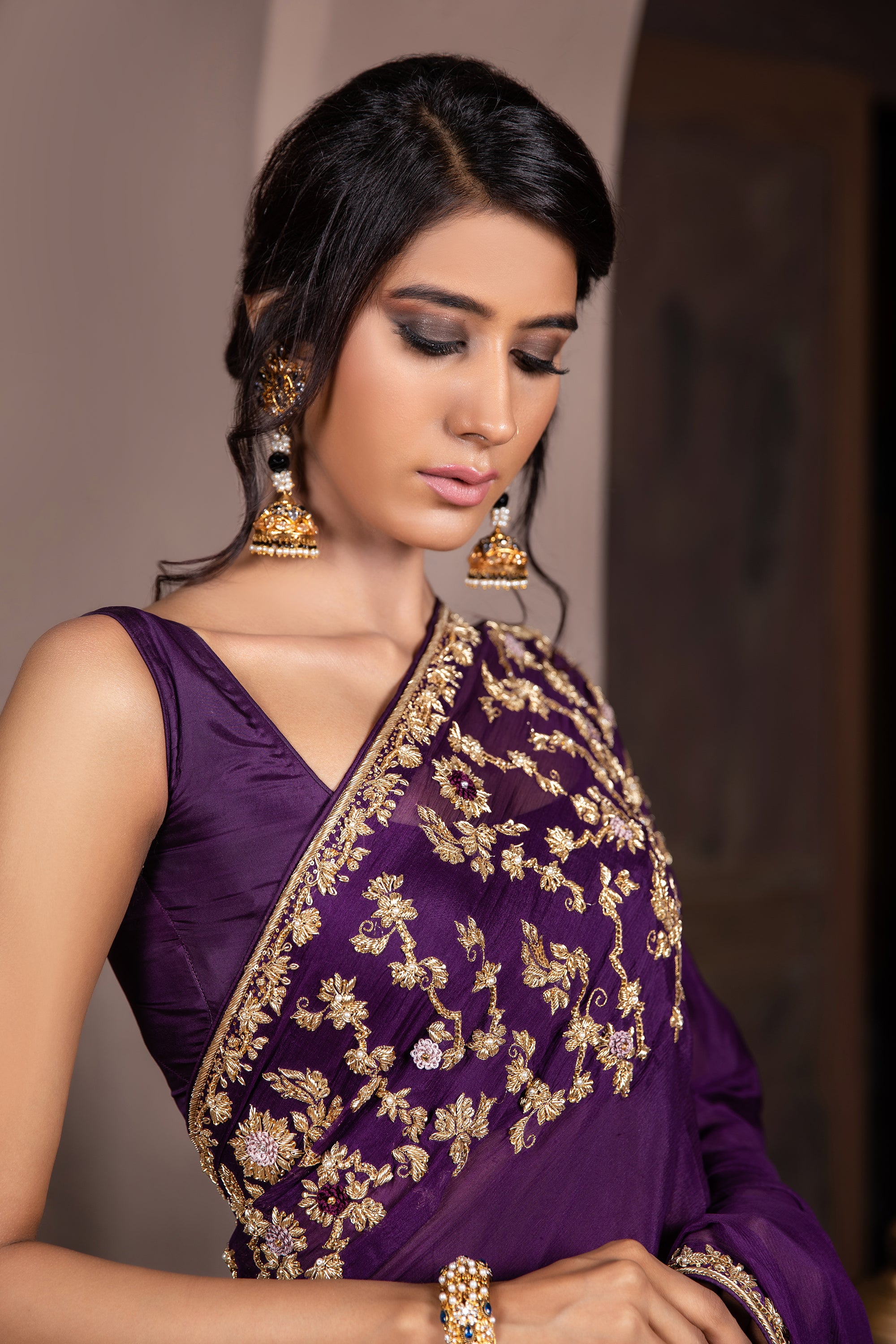 - Accessories: Opt for statement earrings and a chic bracelet to complement the saree’s elegant embroidery. A sleek hairstyle will keep the focus on the saree, allowing its beauty to shine.