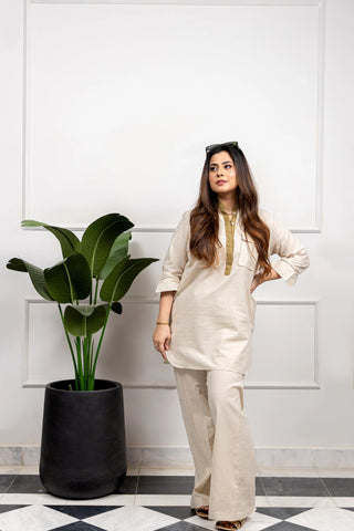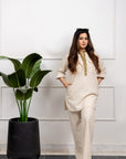 - The Pants: Complementing the shirt, the matching beige pants complete the ensemble with finesse. Tailored for a modern fit, they offer comfort without compromising on style. Whether paired together or mixed with other wardrobe staples, these pants exude effortless elegance and versatility.