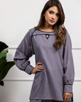 This matching separate is designed for versatility. The top features a modern cut that pairs beautifully with the tailored bottoms, creating a polished look. Alternatively, you can mix and match each piece with your existing wardrobe. The gray top can be styled with jeans or a skirt, while the black-detail bottoms can be paired with a variety of tops for a fresh and trendy outfit.