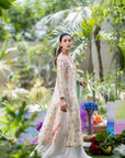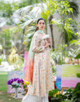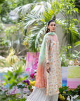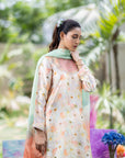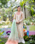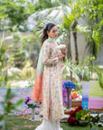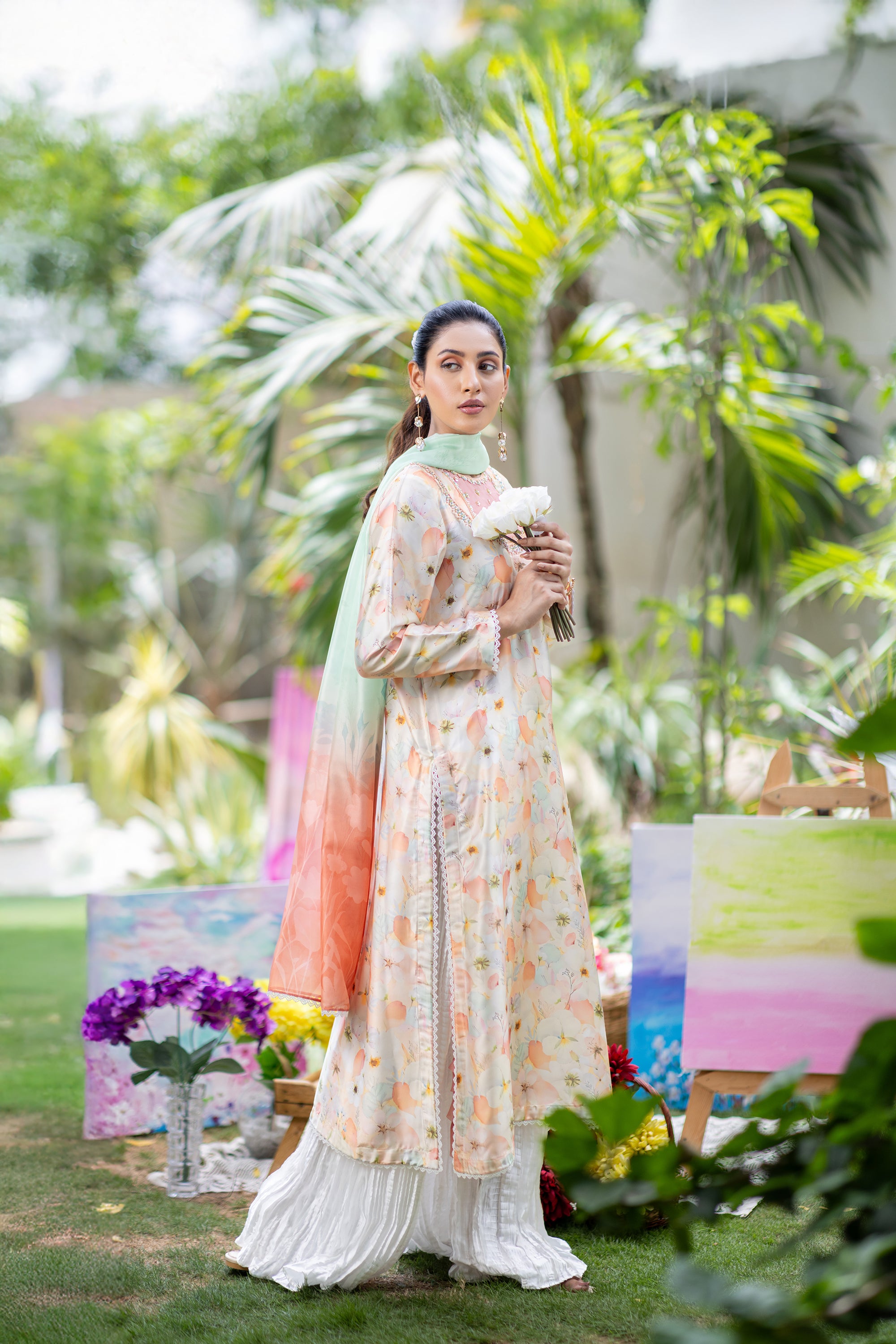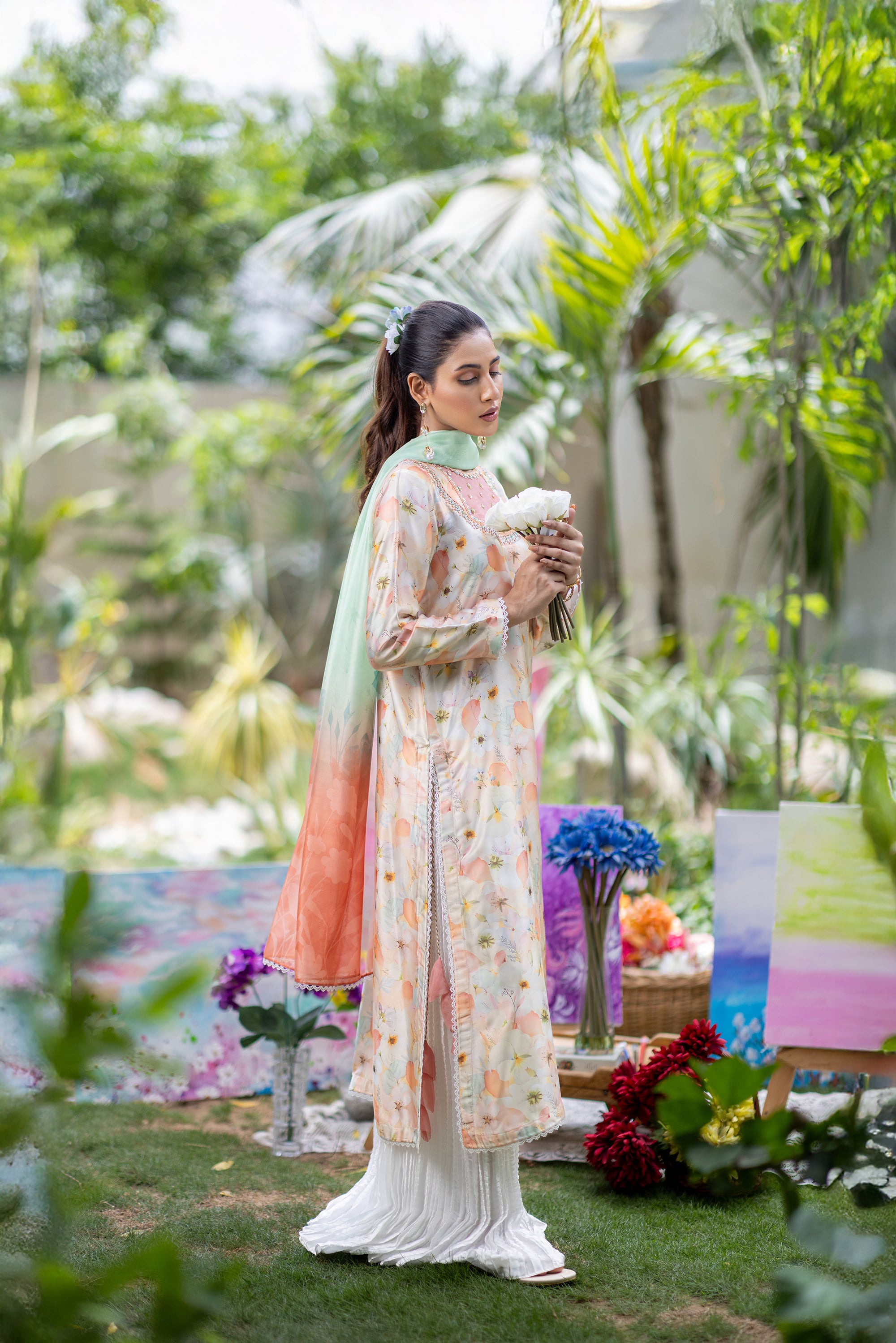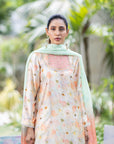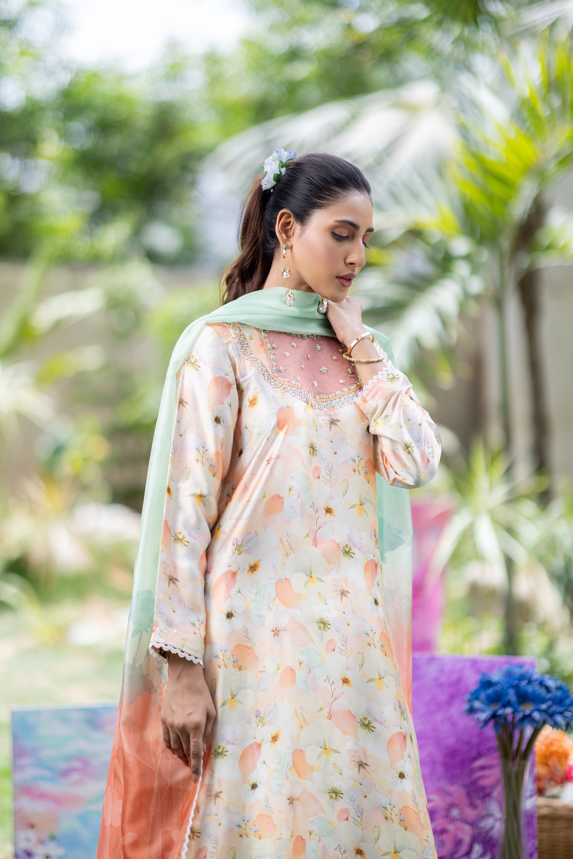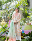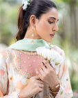 A delicate fusion of pink and mint, this floral printed shirt is elevated with intricate handwork on the neckline. Paired with a printed dupatta and crisp white crushed dhaka pajama, it's perfect for festive gatherings—Eid and well beyond.