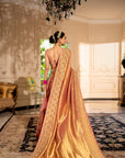 Paired with a flowy tissue satin dupatta, this ensemble radiates grandeur. The dupatta is adorned with heavily embroidered borders, adding richness to the overall look. Its light and airy feel provide a stunning drape, making it the perfect complement to the lehenga’s voluminous silhouette. Whether you choose to carry it over your shoulder or drape it gracefully over your head, the dupatta adds an ethereal charm to your outfit.