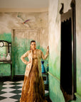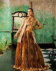 Completing the look is a voluminous crushed silk lehenga in a matching gold tone. The lehenga’s crushed texture adds an element of playfulness to the ensemble, creating a stunning contrast with the jacket's intricate handwork. The lehenga moves gracefully, catching the light with every step, making it a perfect partner to the shimmering jacket and blouse.