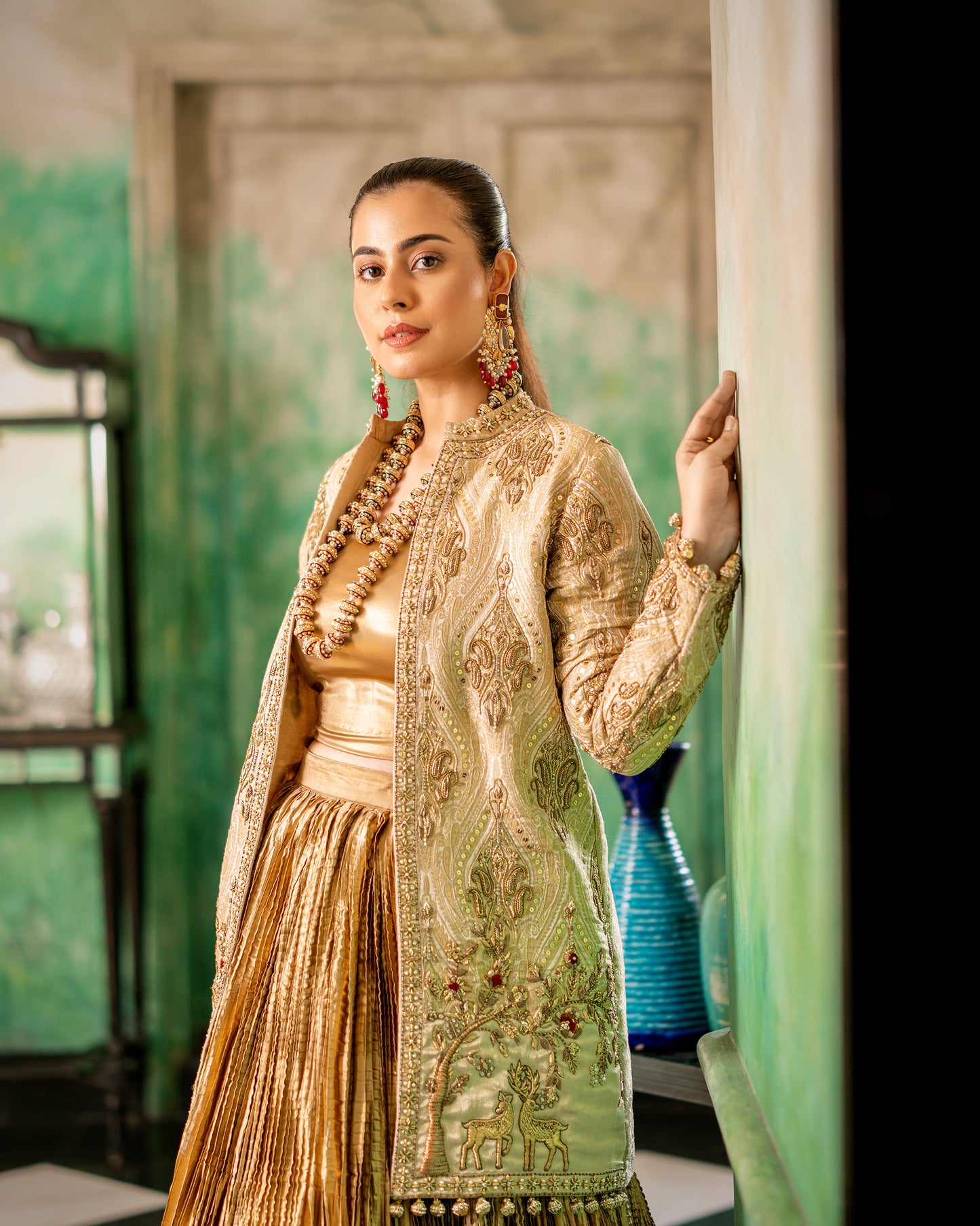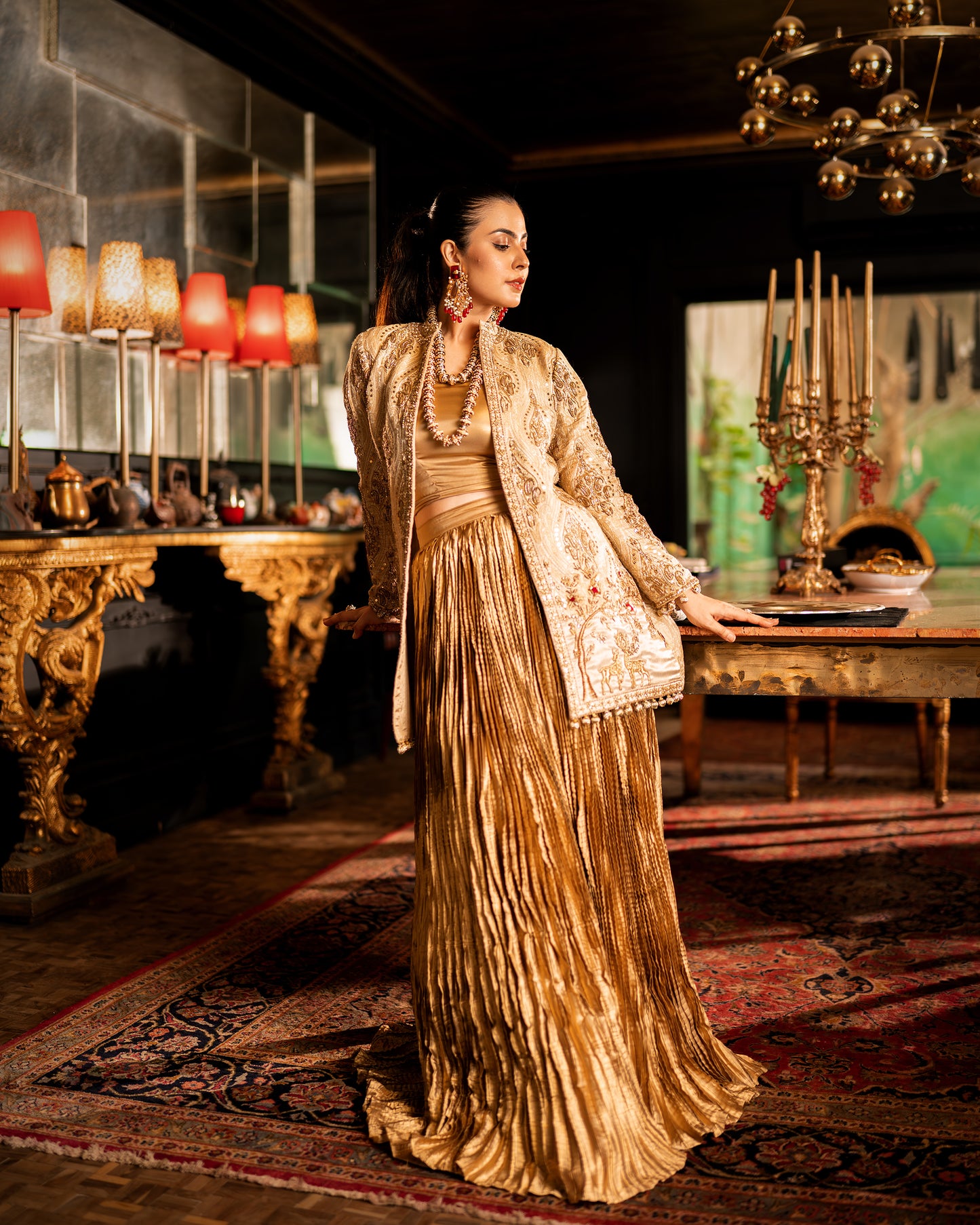 - Opulent fabric: The finest Banarsi, silk, and crushed silk fabrics, all in rich gold hues.