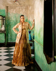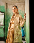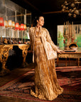 At the heart of this outfit is a Banarsi gold jacket, intricately adorned with meticulous hand embroidery. Every inch of the jacket reflects the artistry of skilled craftsmen, making it a true masterpiece. The rich gold hue shimmers with a regal glow, while the lavish Banarsi fabric adds a touch of tradition and royalty. The jacket’s structured design offers a flattering silhouette, making it the perfect choice for festive occasions, weddings, or high-profile events where making a statement is key.