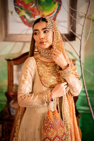 The hand-embroidered motifs and detailed craftsmanship throughout the dress reflect the dedication of skilled artisans. The dabka zardozi work sparkles gracefully, while the resham thread creates a subtle contrast that brings out the richness of the fabric and design. This blend of gold embroidery with soft threadwork strikes the perfect balance between tradition and contemporary style.