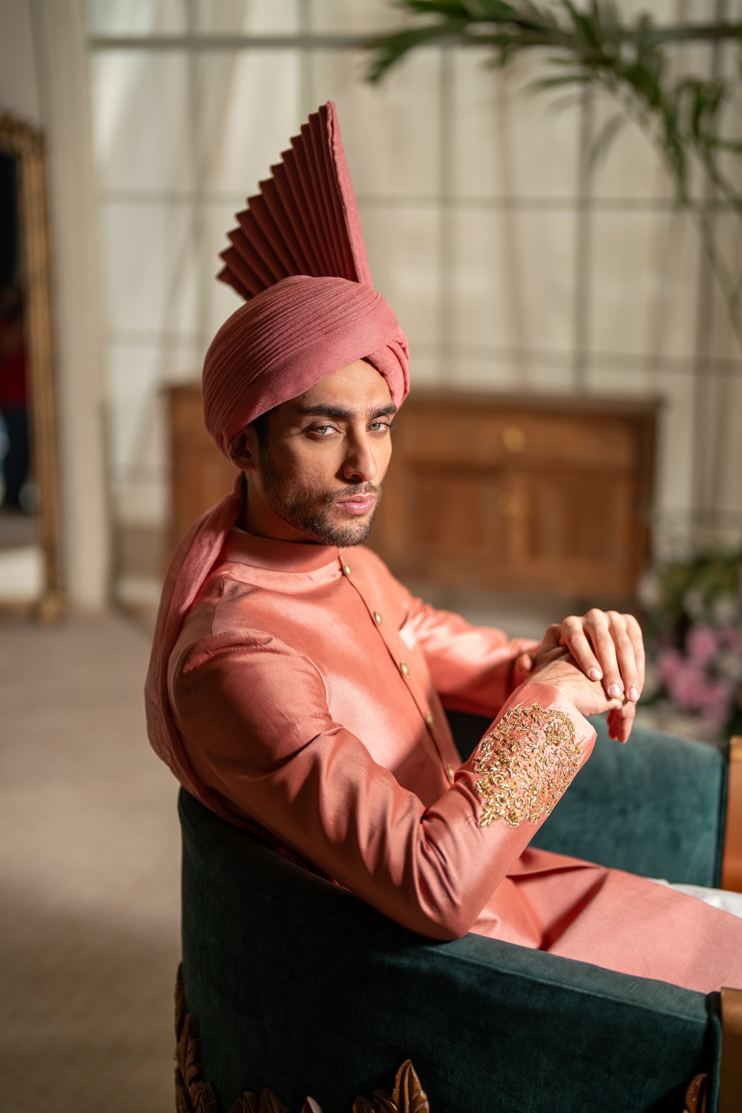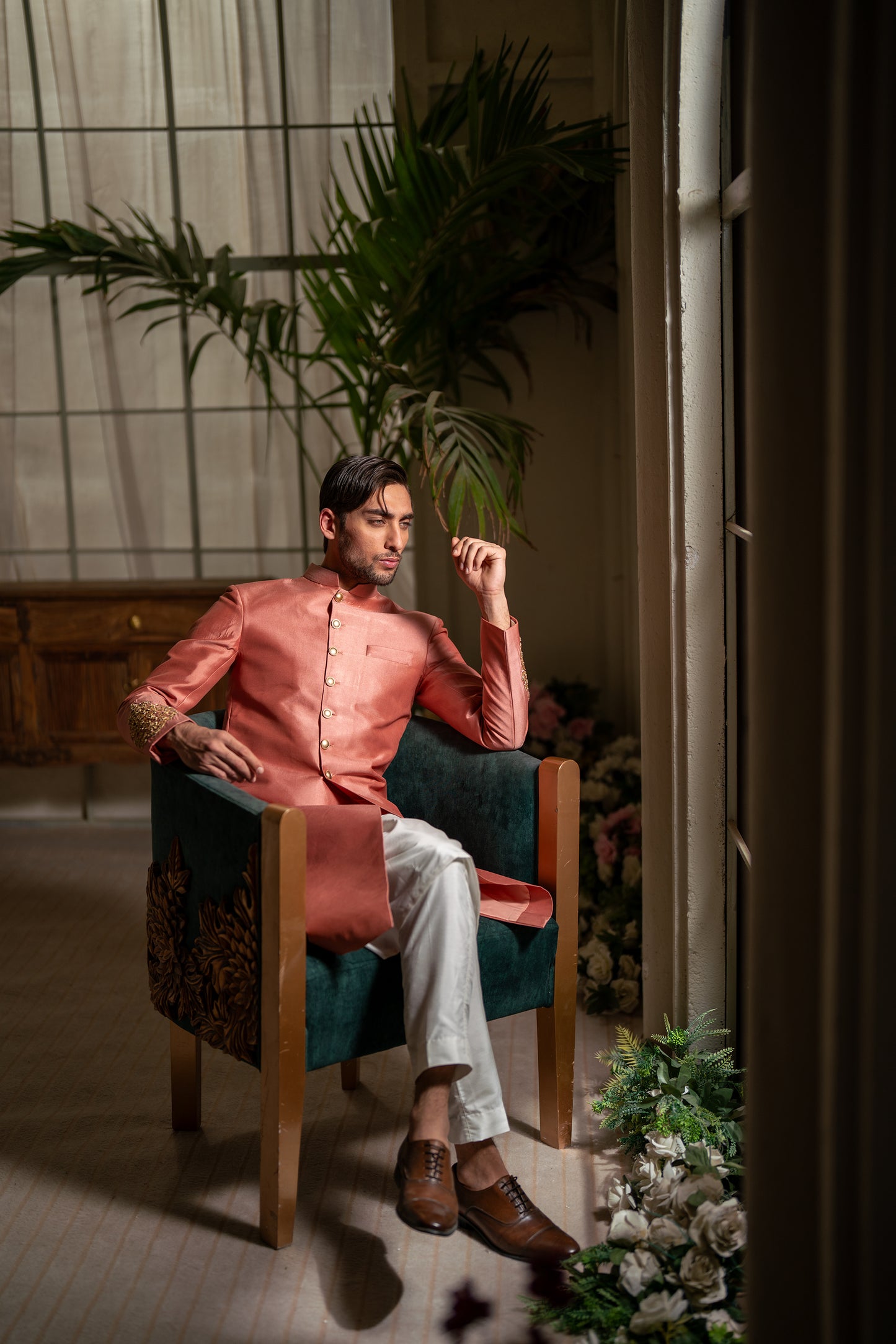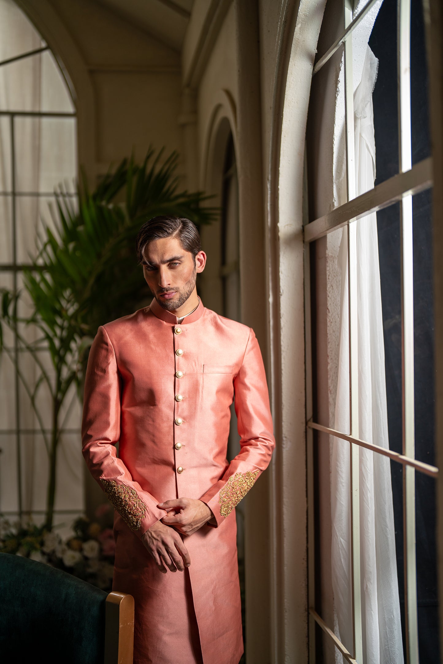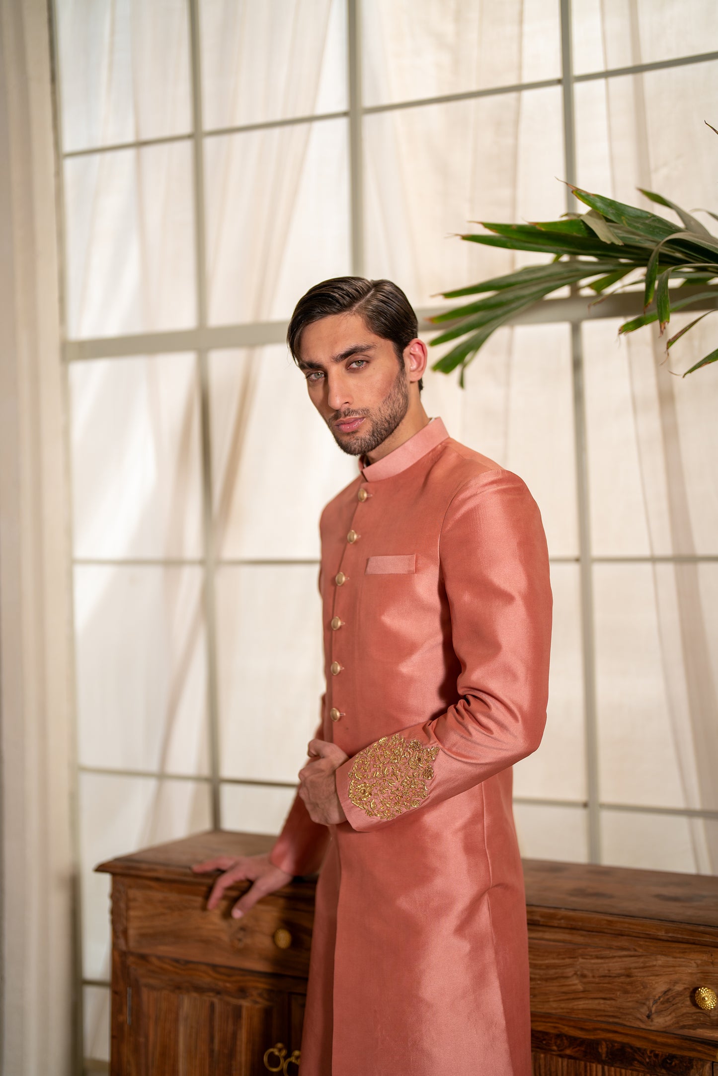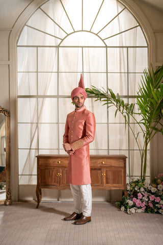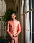 Embrace tradition with a contemporary twist—make the Noorie - Pink Sherwani a standout piece in your wardrobe today! Perfect for the modern man who appreciates the elegance of classic attire.