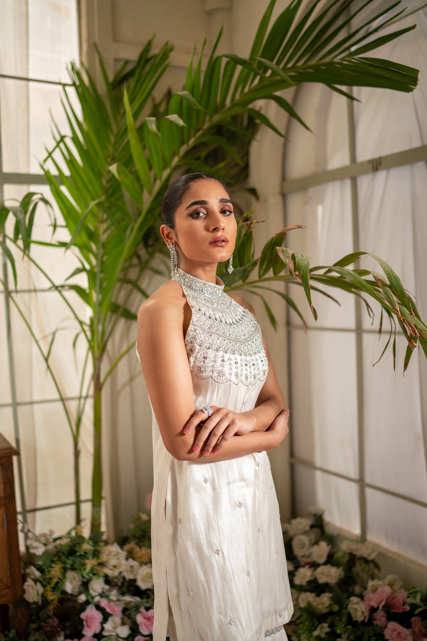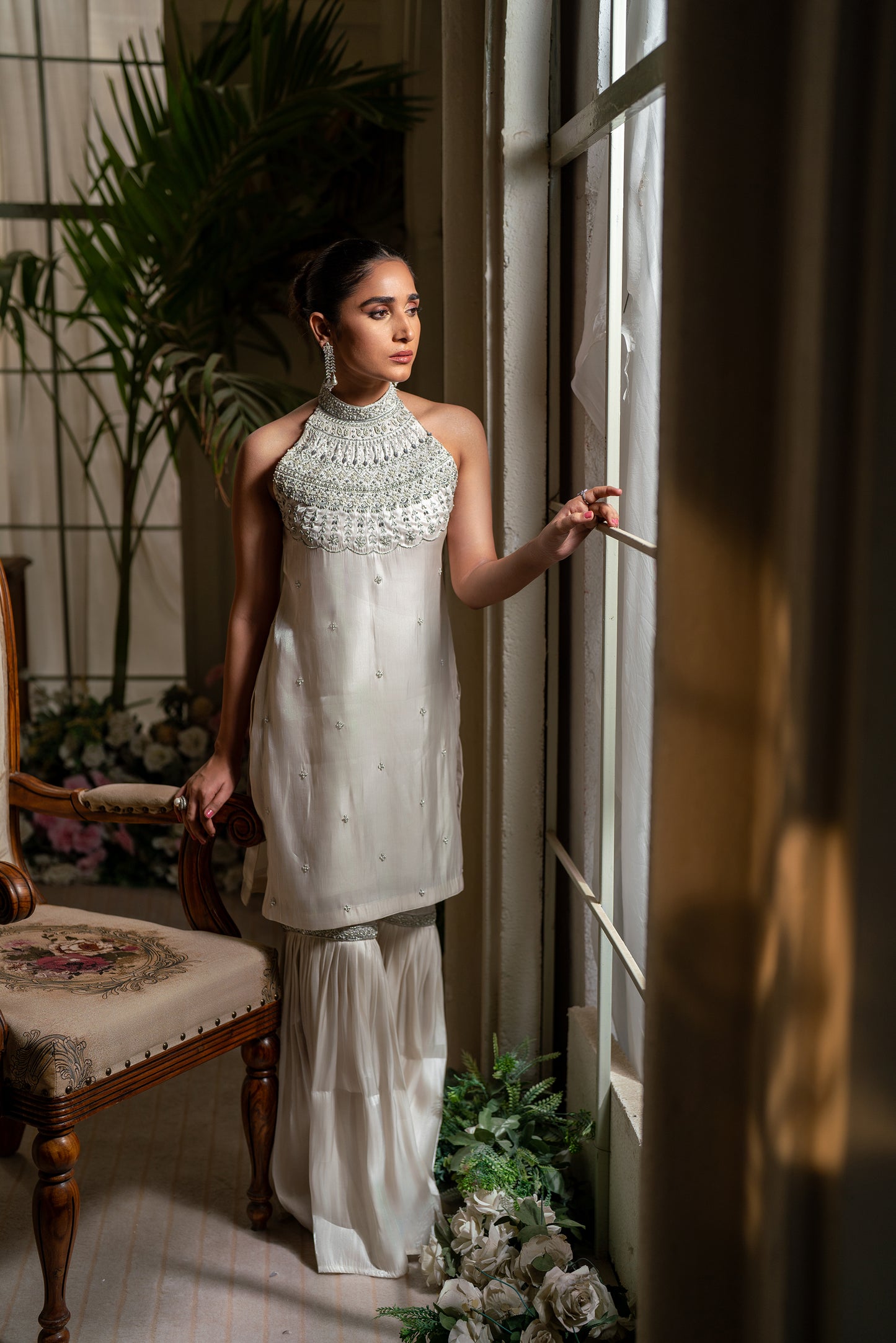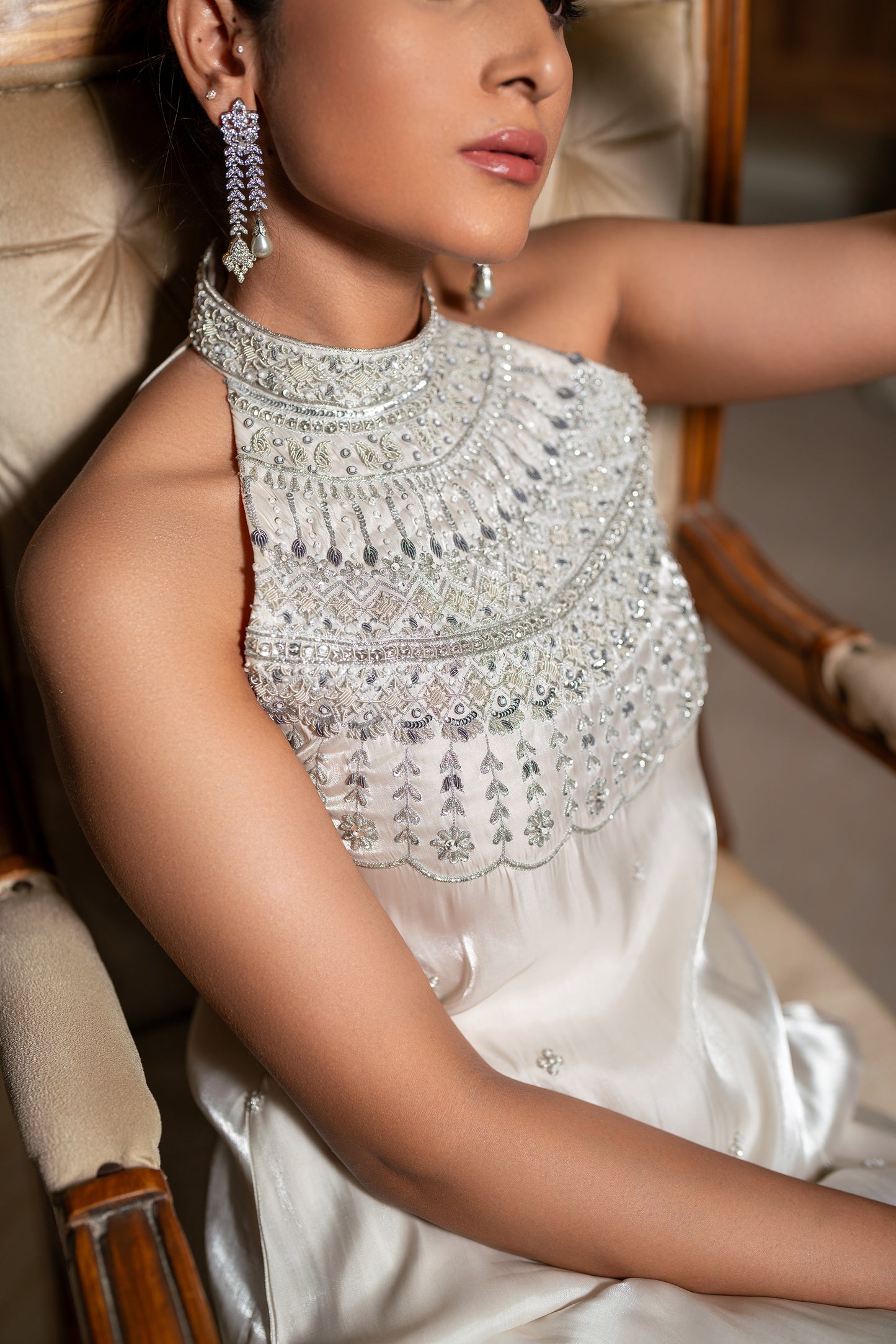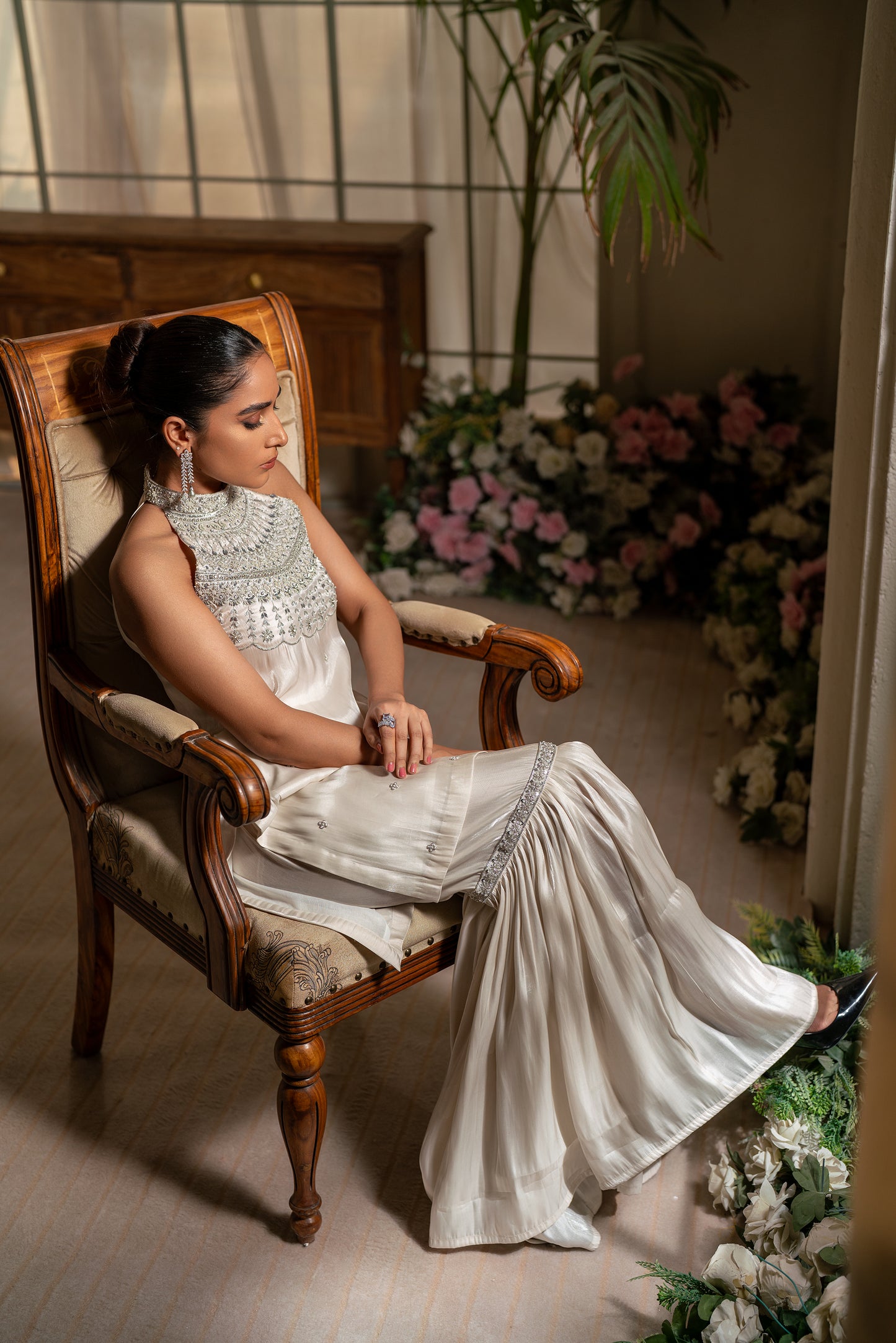 - A silver satin shirt and gharara pants with heavily dabka embellished neckline.
