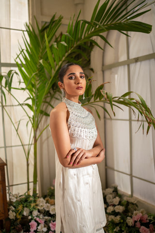 Step into timeless grace with Noorie, a silver satin ensemble that speaks sophistication at every glance. The luxurious satin shirt, gleaming with a soft silver sheen, drapes you in effortless elegance. The focal point? A neckline heavily adorned with intricate dabka work, shimmering with delicate craftsmanship that exudes regal charm. Each detail of the embellishment is thoughtfully designed to add a touch of traditional grandeur, perfect for those who love to make a statement.