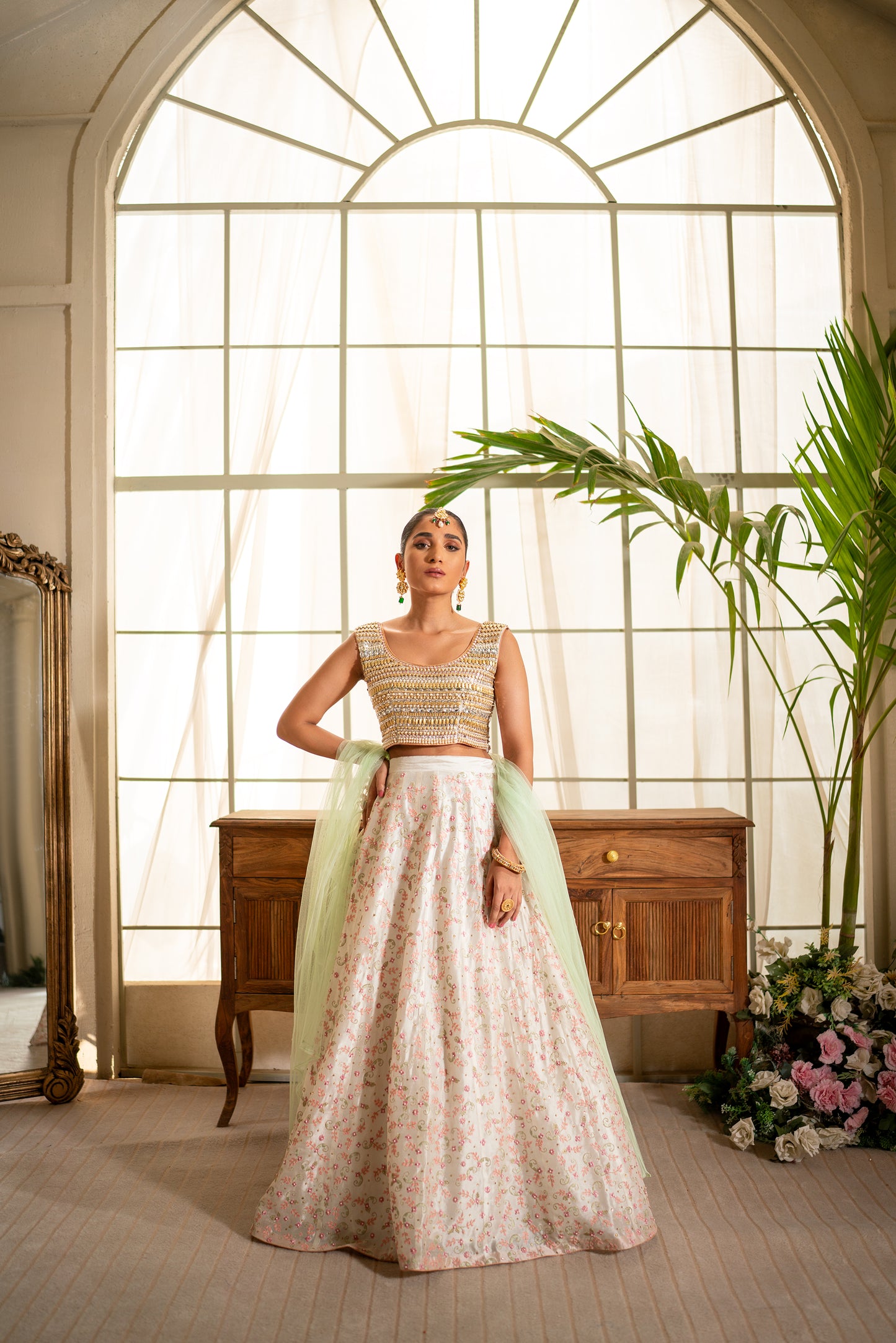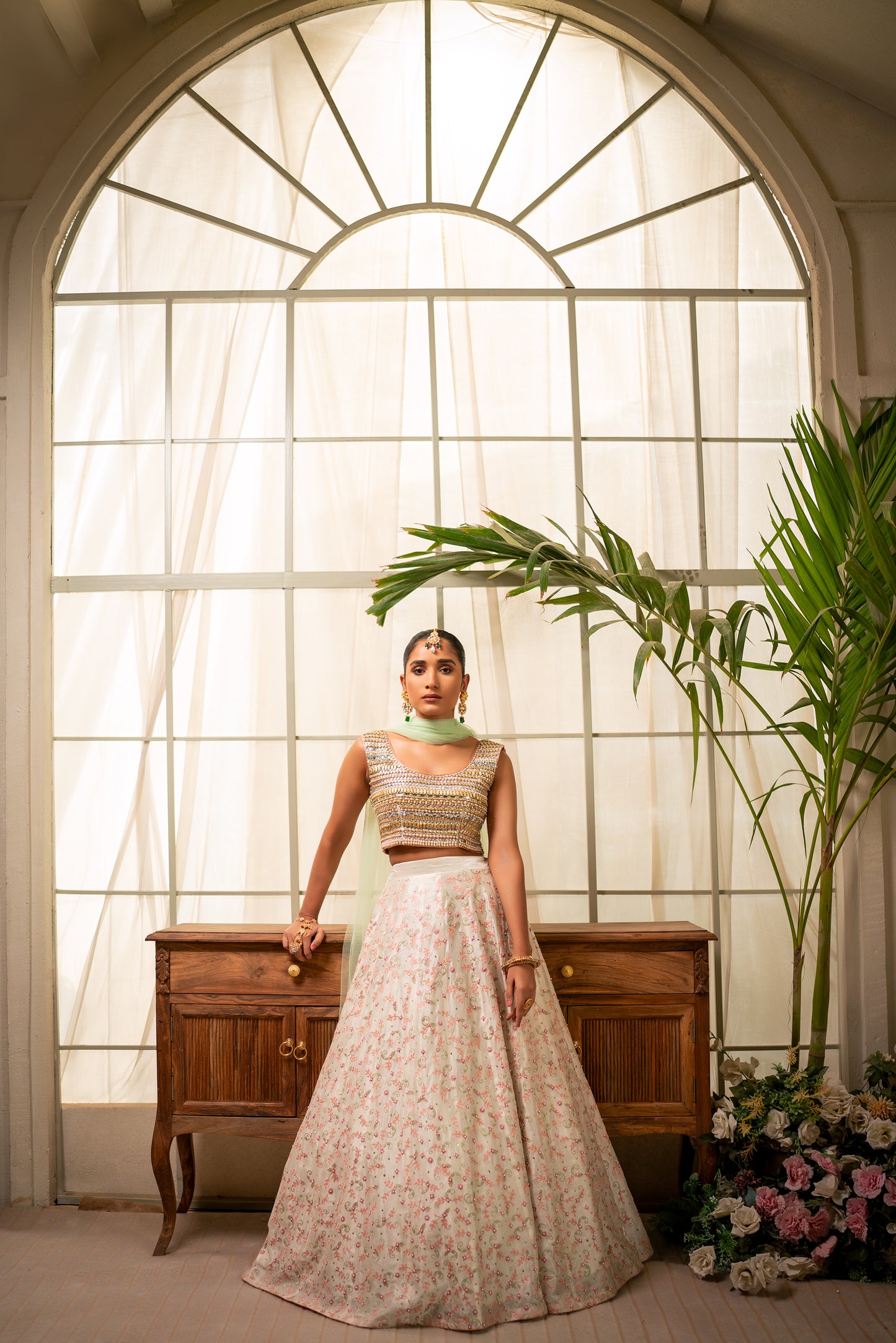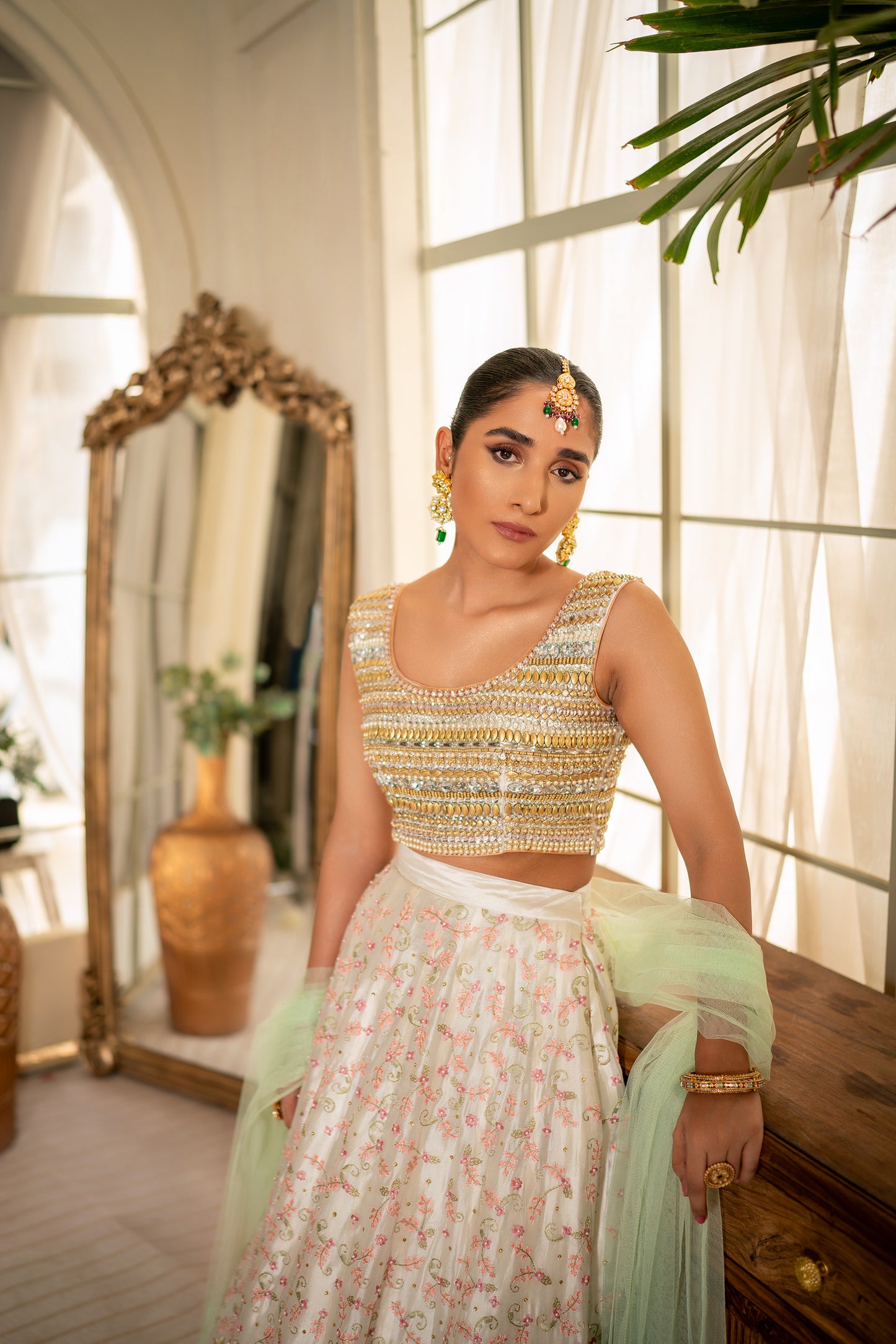 - Ivory lehnga choli with intricate resham and pearls work all over the lehenga.