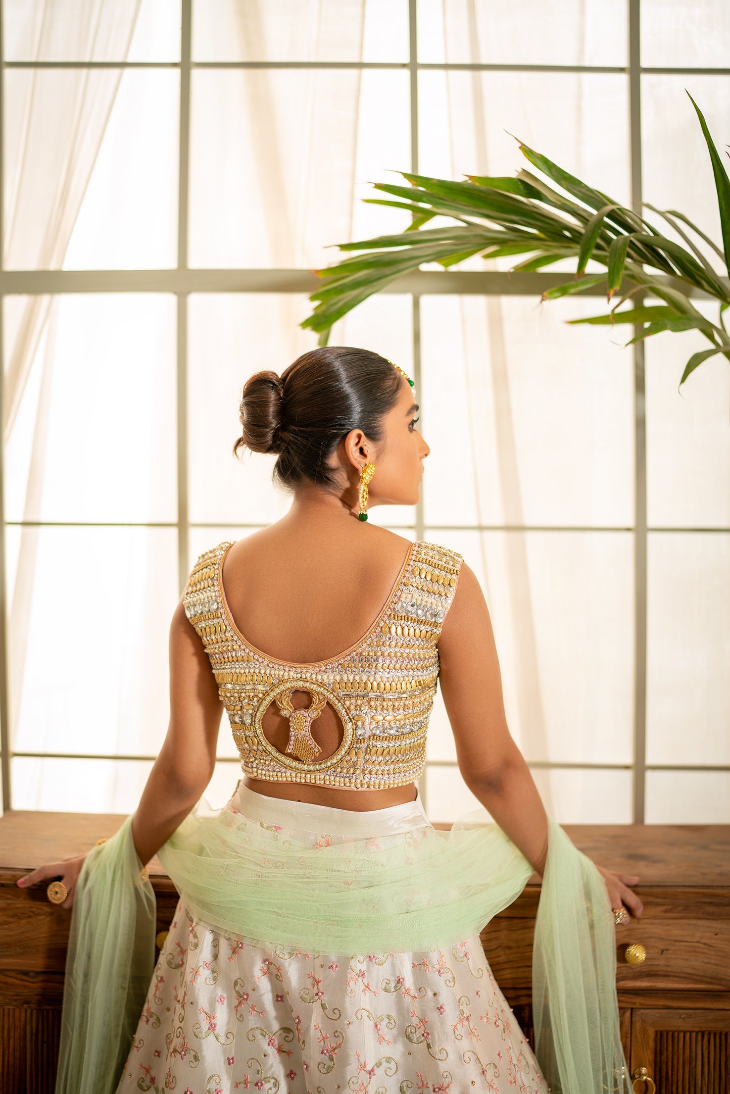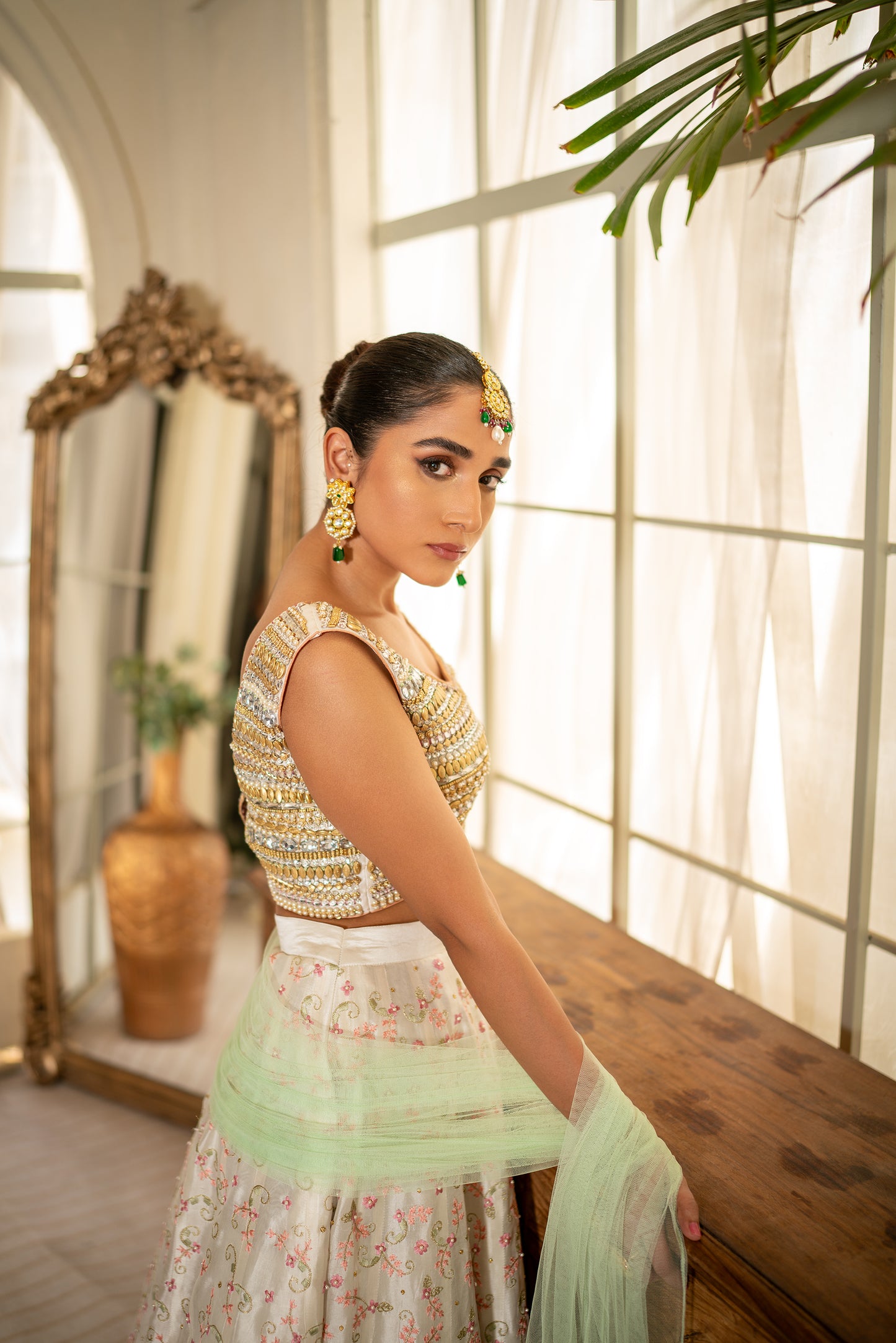 The flowing ivory lehnga is adorned with delicate resham and pearls work, creating a captivating texture that exudes opulence. Each intricate detail weaves together a tapestry of sophistication, ensuring you turn heads with every twirl. - Blouse: An Embellished Masterpiece