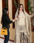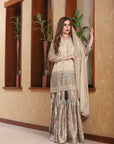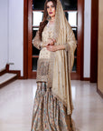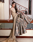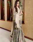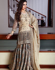 The shirt and sleeves are adorned with intricate handwork, showcasing delicate embellishments that shimmer with every move. The daaman (hem) features detailed craftsmanship, adding a regal touch to the outfit. Each piece tells a story of timeless artistry, while the dupatta is lined with a beautiful dabka border, creating a look that’s rich in heritage and splendor.