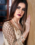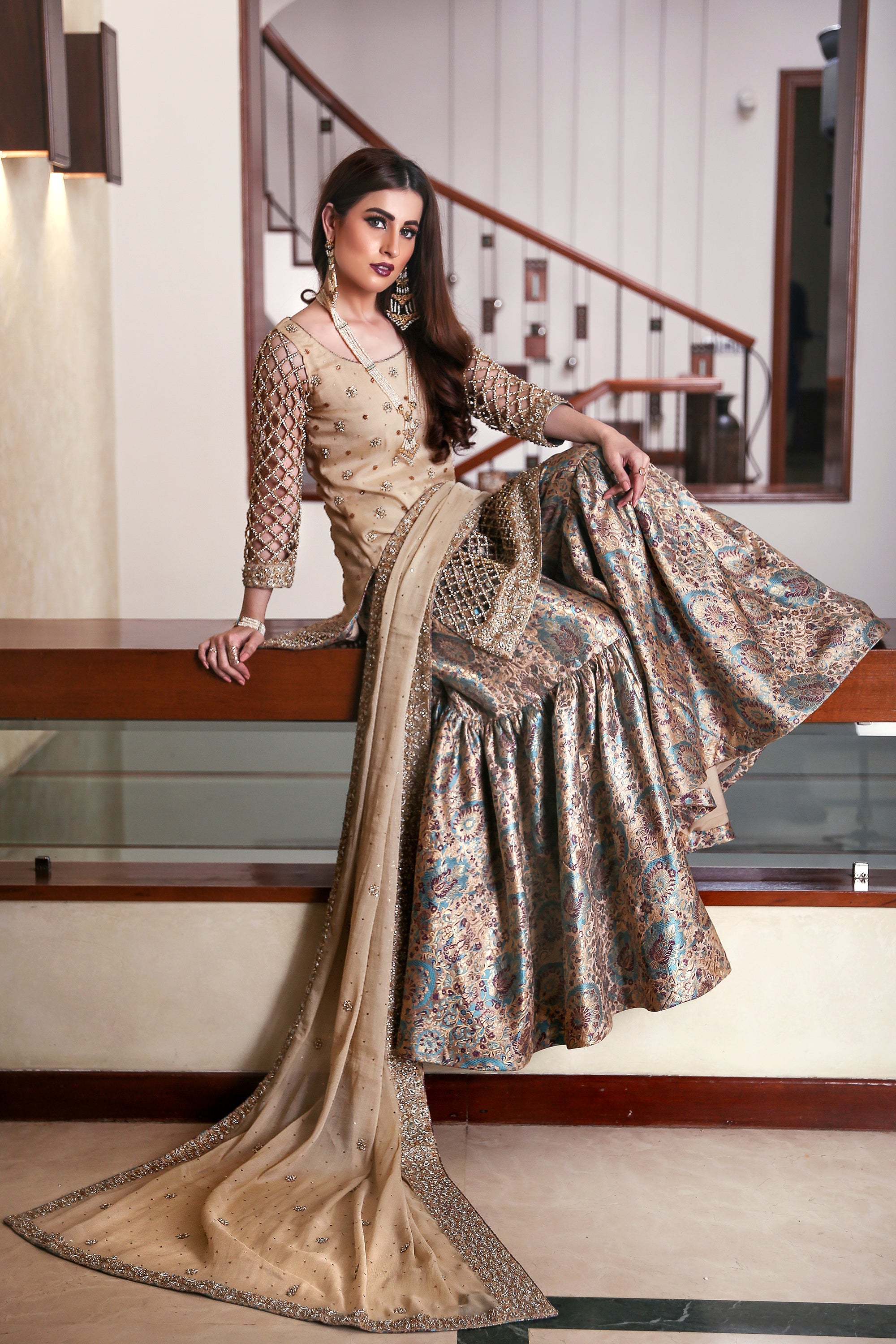 Crafted from pure Maisuri fabric, the ensemble exudes luxury and comfort, ensuring you feel as exquisite as you look. Paired with a pure Kamkhwab gharara, the outfit offers a sophisticated silhouette that is both flattering and majestic. The lavish fabric and stunning embroidery make this bridal set a true work of art, perfect for making unforgettable memories on your wedding day.