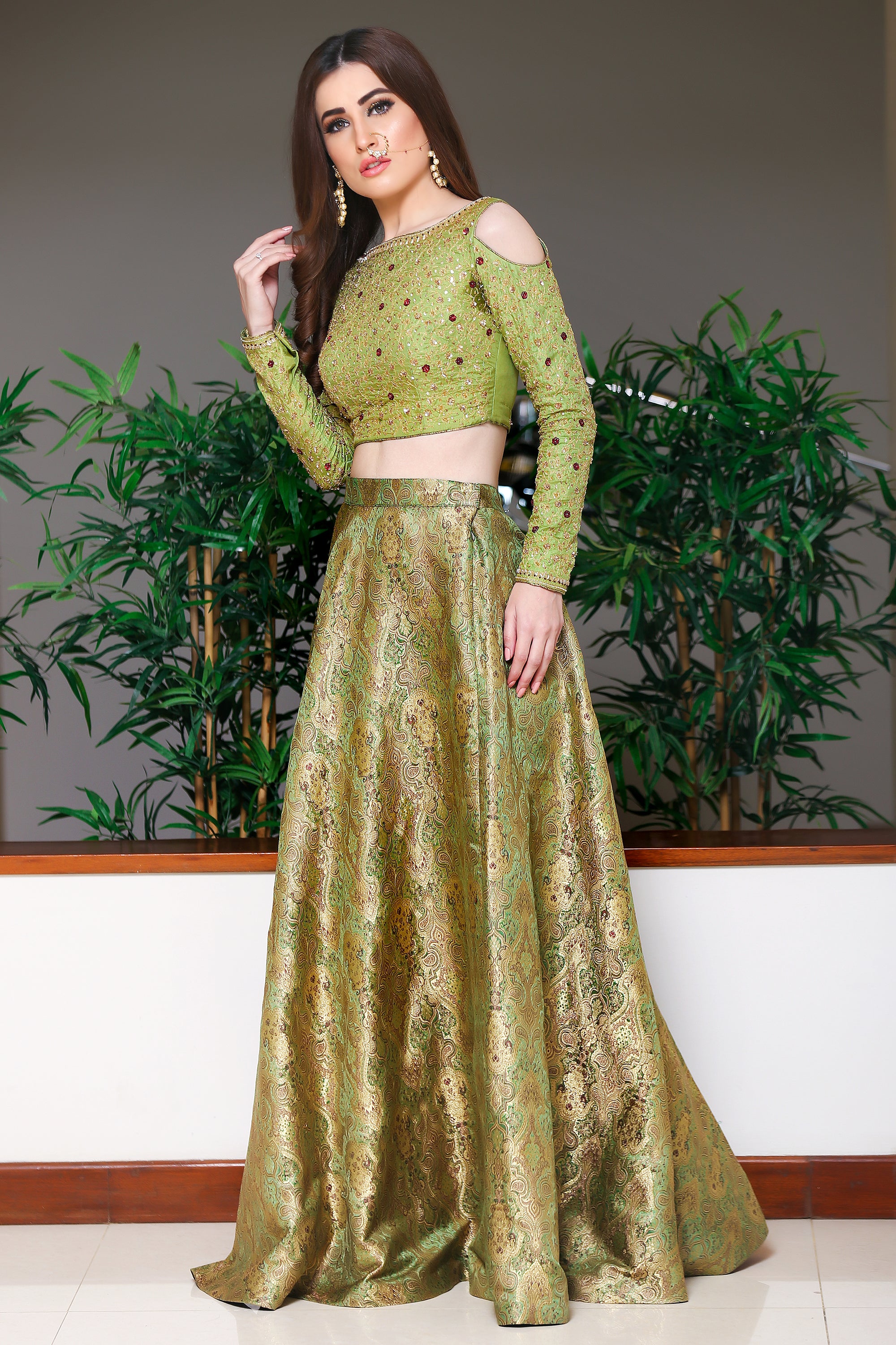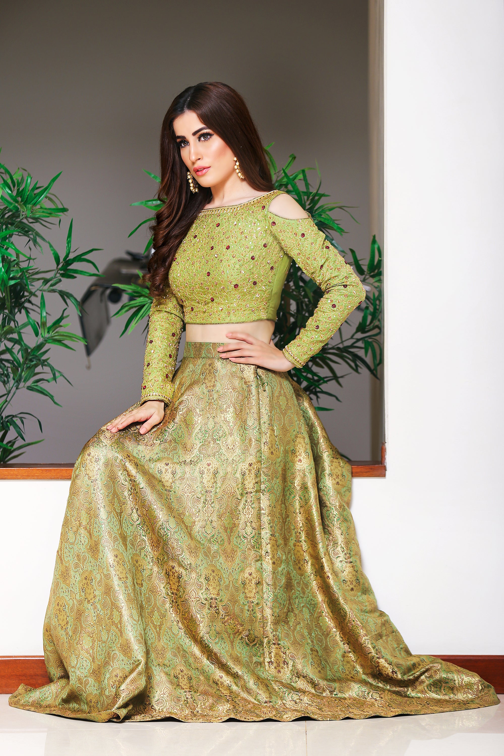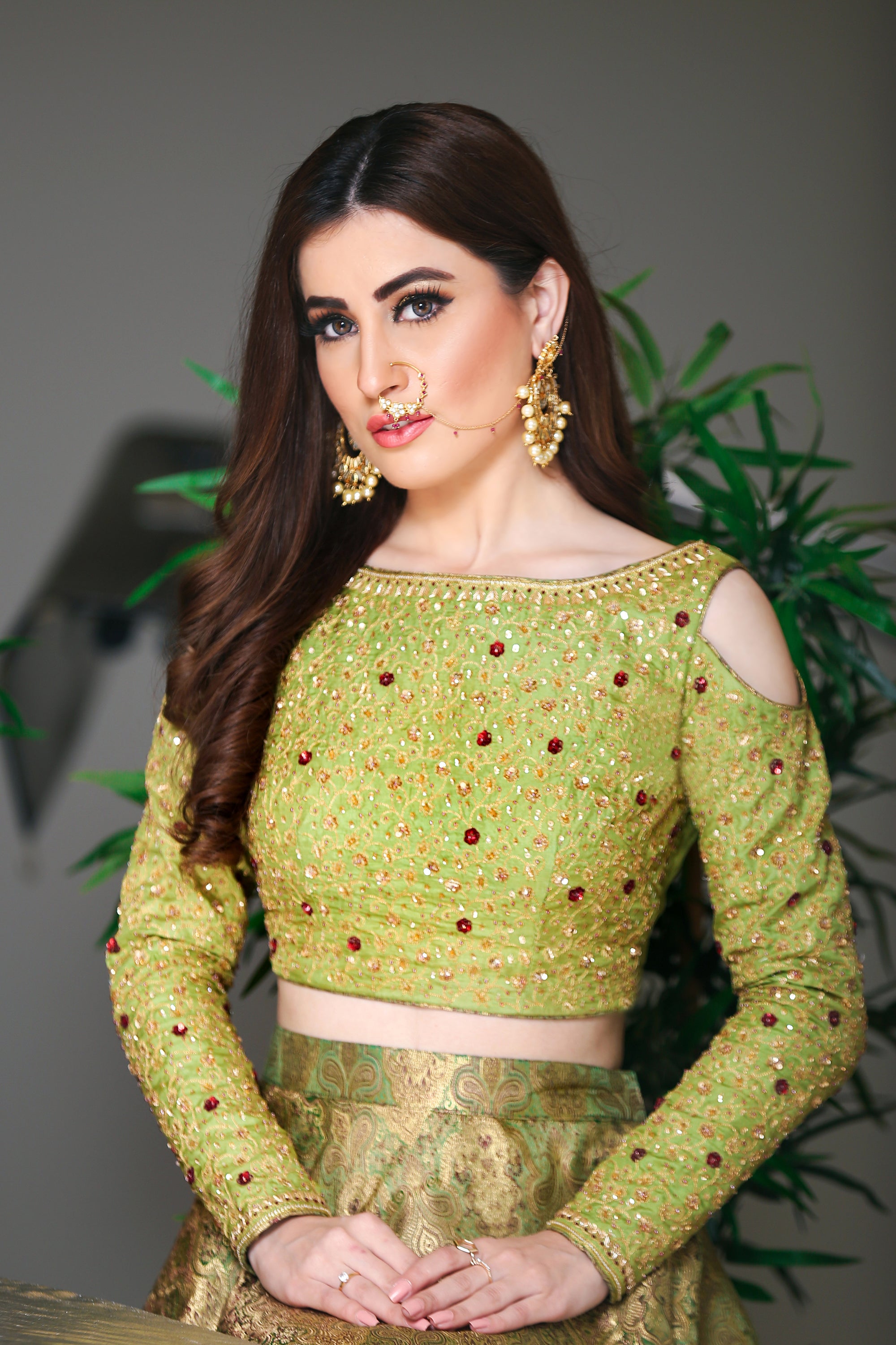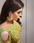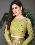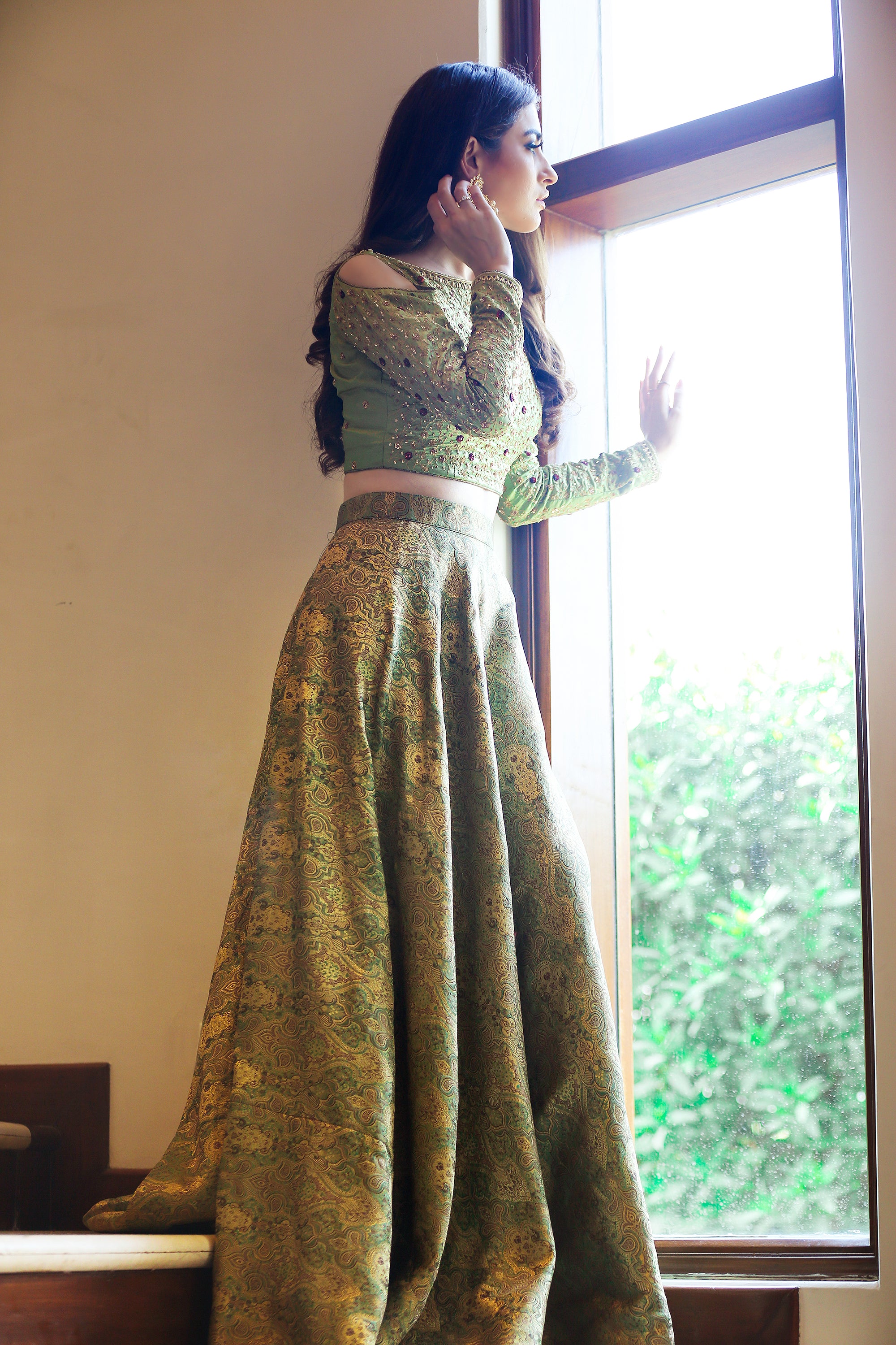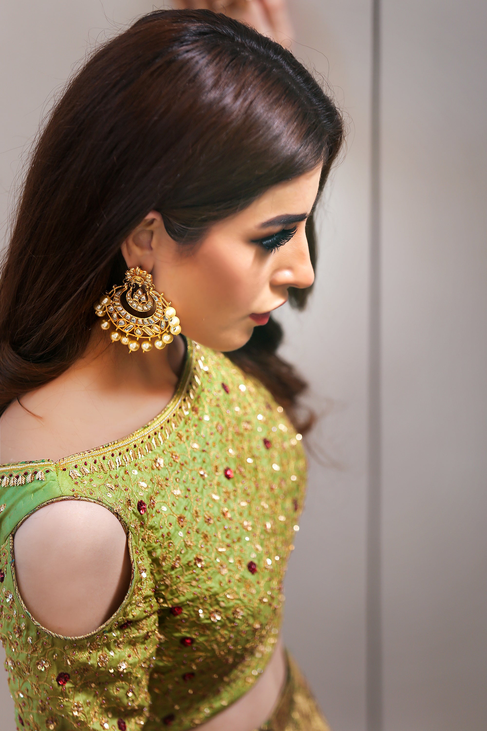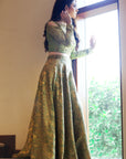 - Kamkhawb Lehnga: The flowing kamkhawb lehnga in rich green complements the blouse perfectly, offering grace with every step.