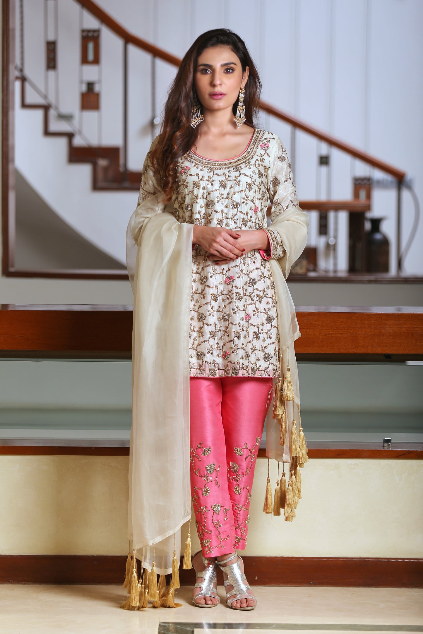 - Paired with raw silk pants with dabka work.