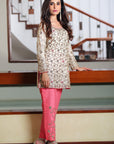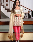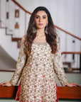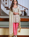 Paired with luxurious raw silk pants that feature complementary dabka work, the ensemble offers a rich contrast in texture. The smooth, lustrous silk pants balance the delicacy of the khadi net, ensuring you make a statement from head to toe. Whether it's a festive celebration, a wedding event, or an elegant gathering, Puro Seda - White & Pink promises to make you stand out with its refined aesthetic and timeless appeal.