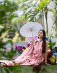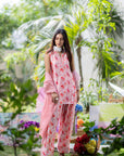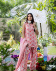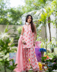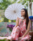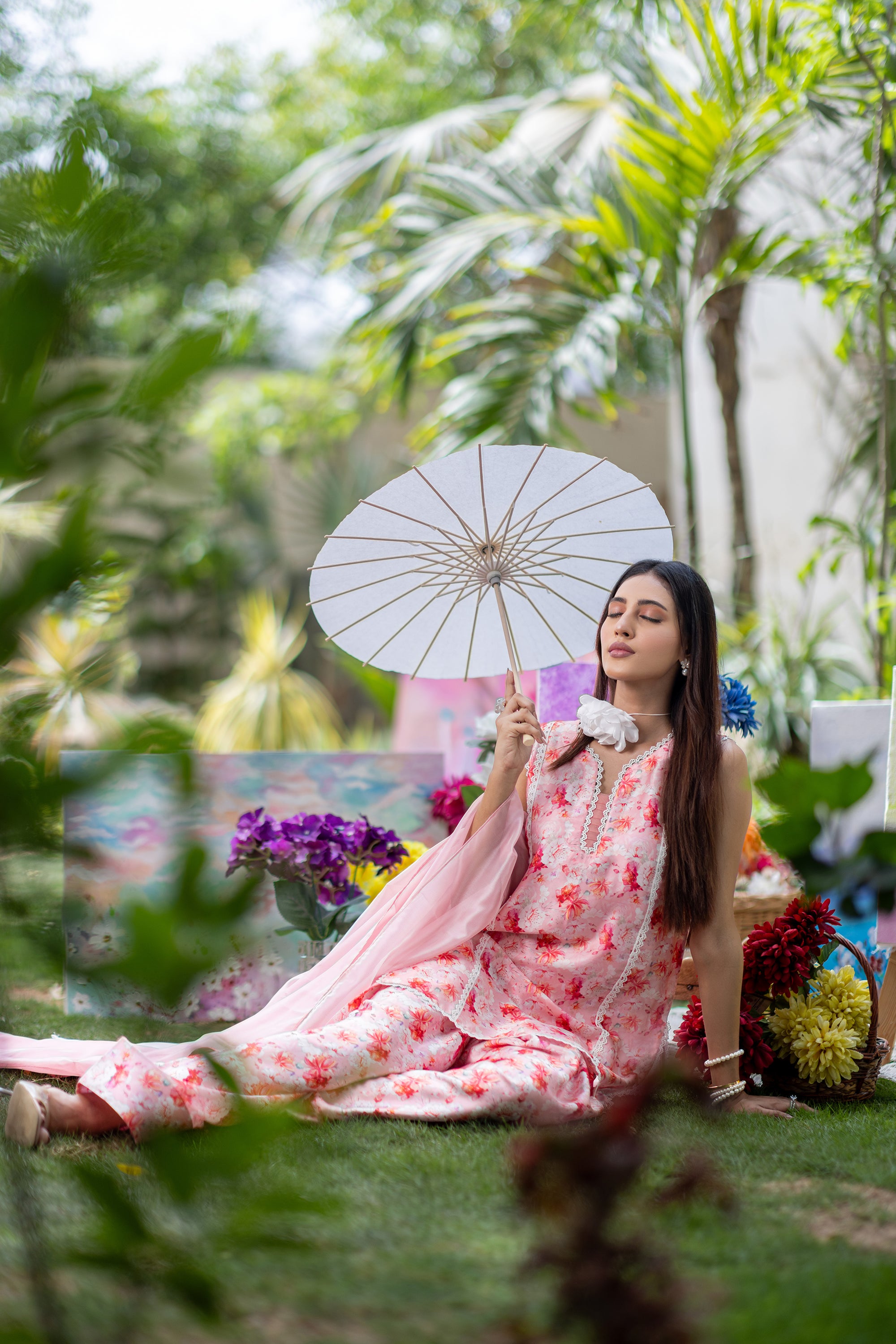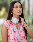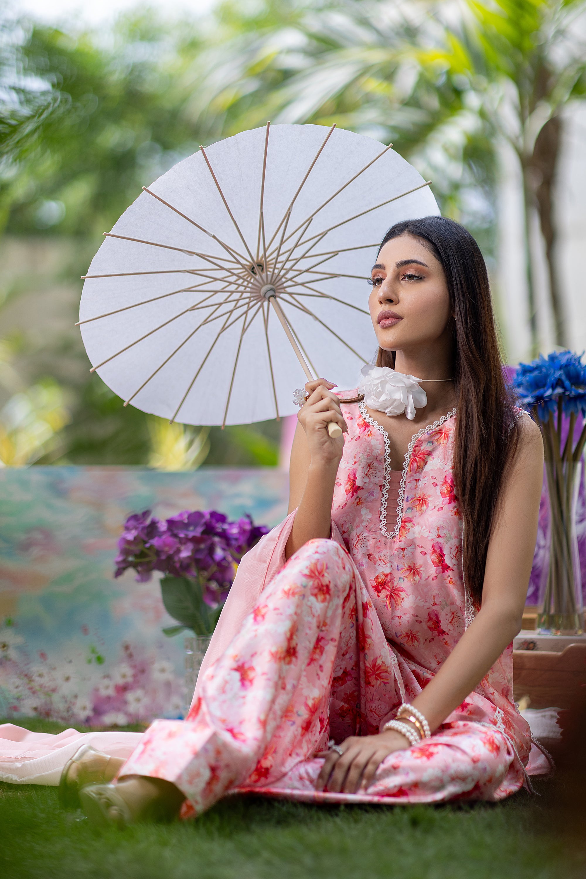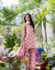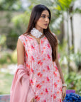A soft summer statement in sherbet pink floral silk. This 3-piece set features a sleeveless short shirt with lace edging, a classic farshi shalwar, and a flowing shaded dupatta. Lightweight, feminine, and perfect for family gatherings.