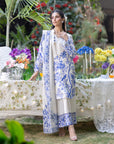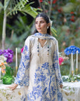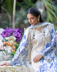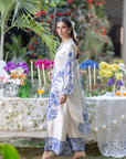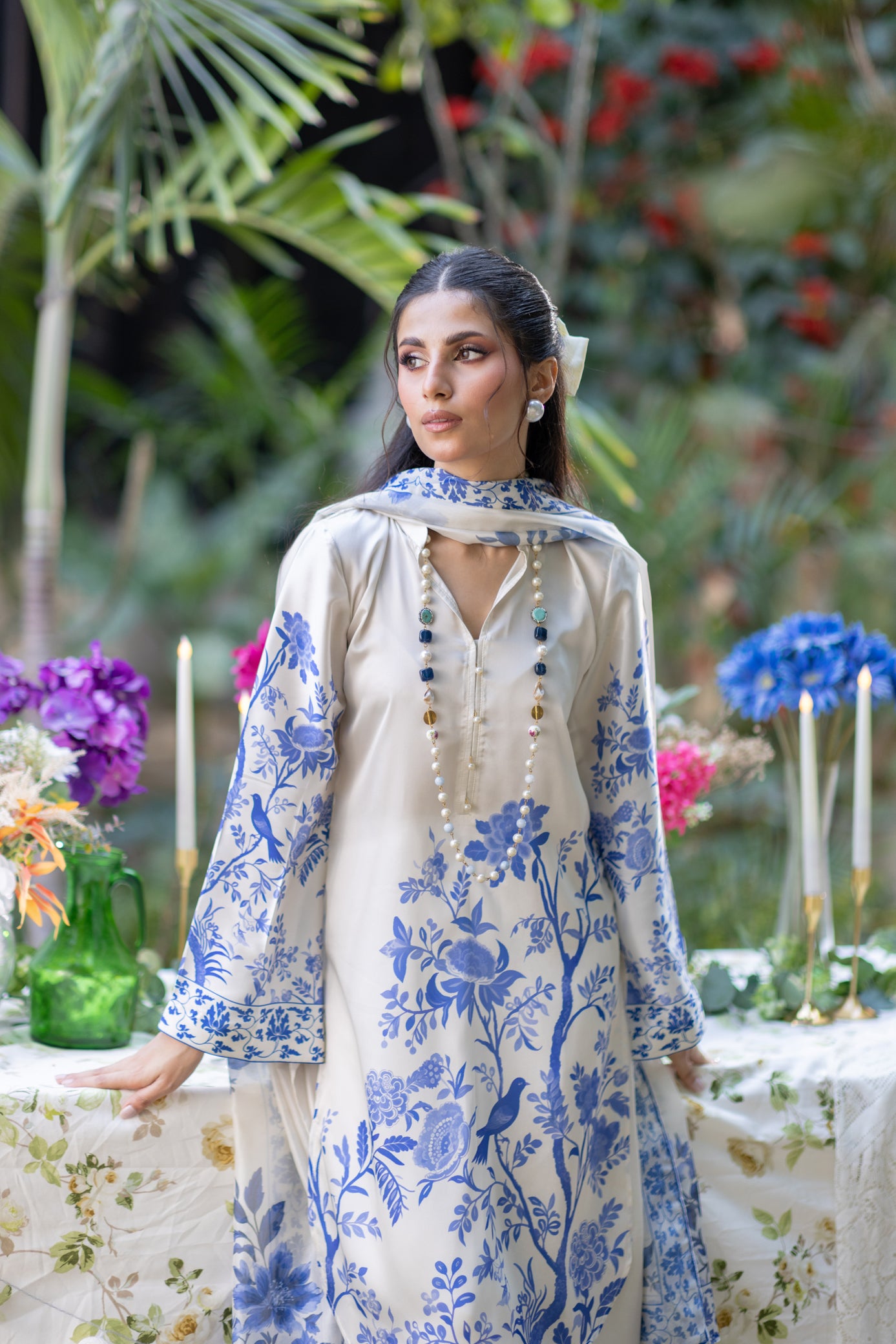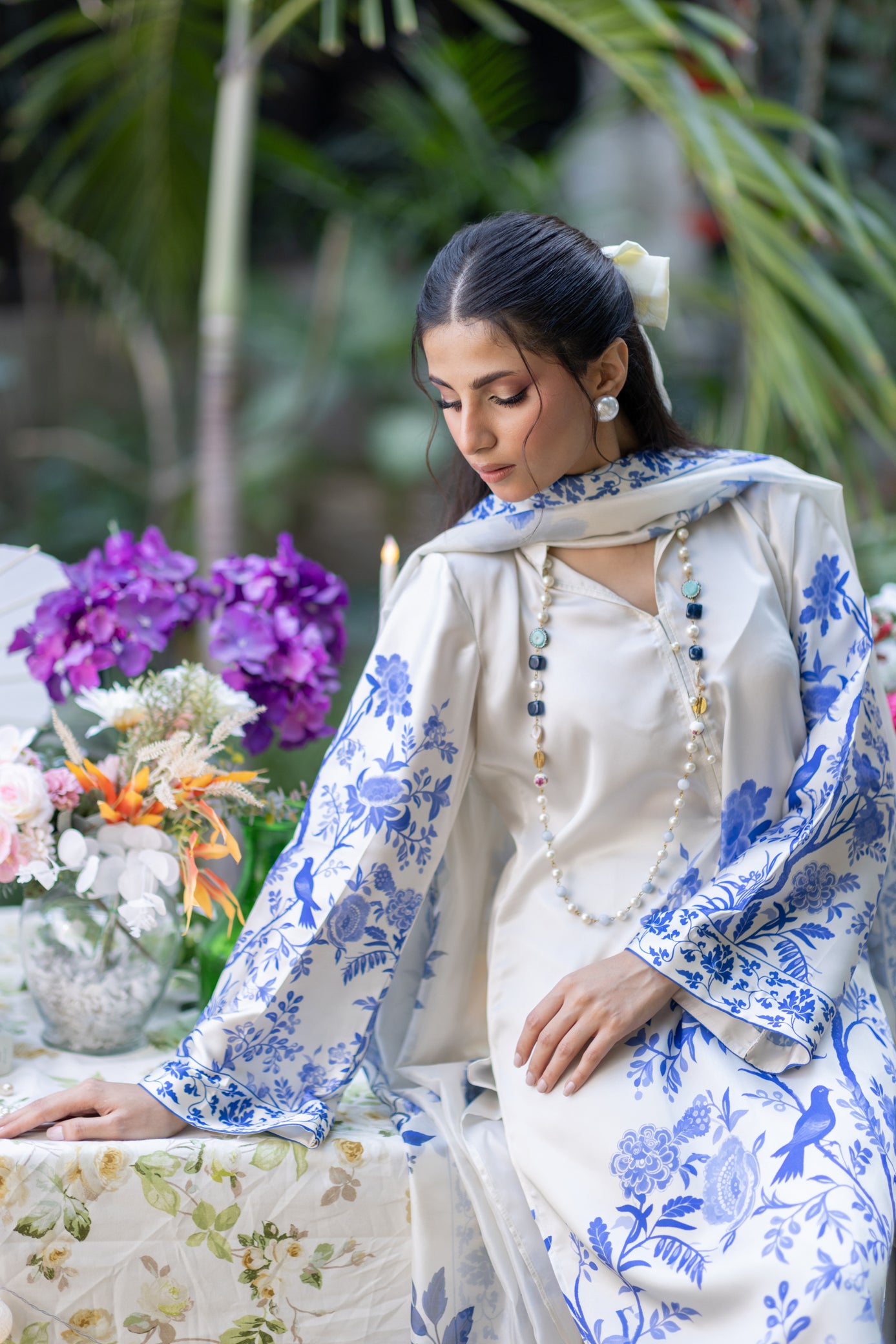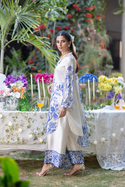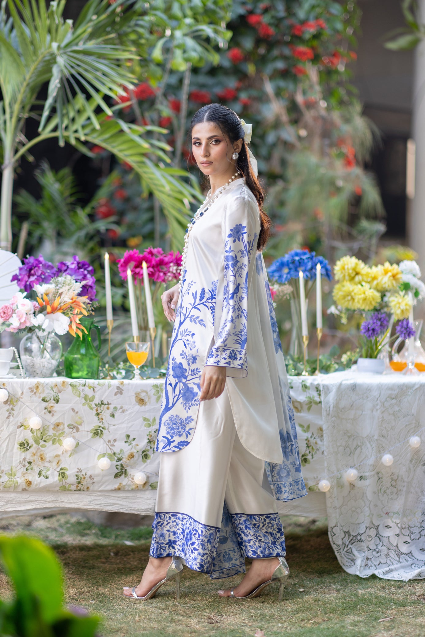 A printed silk short shirt in a timeless blue-on-ivory design, paired with chic culottes and a flowy georgette dupatta. This ensemble exudes refined elegance with a modern touch, perfect for any occasion.