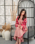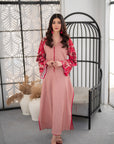 The soft salmon pink base features delicate vertical stripes that add a touch of subtle contrast, elongating the silhouette and offering a flattering fit for all body types. The breathable, high-quality fabric ensures you stay comfortable all day long, whether you're attending a casual day out or a semi-formal gathering.
