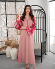 What truly sets this outfit apart are the exquisite Chikaan-embroidered sleeves. Meticulously crafted, these sleeves showcase intricate, hand-done Chikaan embroidery that adds a pop of personality and cultural richness to the outfit. The delicate threadwork, combined with vibrant printed details, creates an eye-catching fusion of tradition and modern design, perfect for those who appreciate artistry in fashion.
