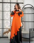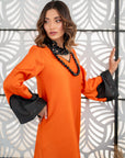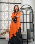 The standout feature of this ensemble is the ankle-length shirt, beautifully designed in a rich black hue that serves as a perfect canvas for the vibrant orange accents. The contrasting colors create a striking visual appeal, making it a must-have for your festive wardrobe. The shirt is adorned with meticulously handworked borders, showcasing intricate embroidery that reflects traditional craftsmanship. Each stitch tells a story of artistry and elegance, enhancing the overall look and feel of the outfit.