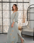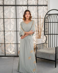 Step into sophistication with our Grey Kaftan, a true masterpiece of elegance and craftsmanship. This stunning piece, designed to make you stand out effortlessly, features an exquisite handworked pattern that runs all over, creating a delicate yet bold statement.