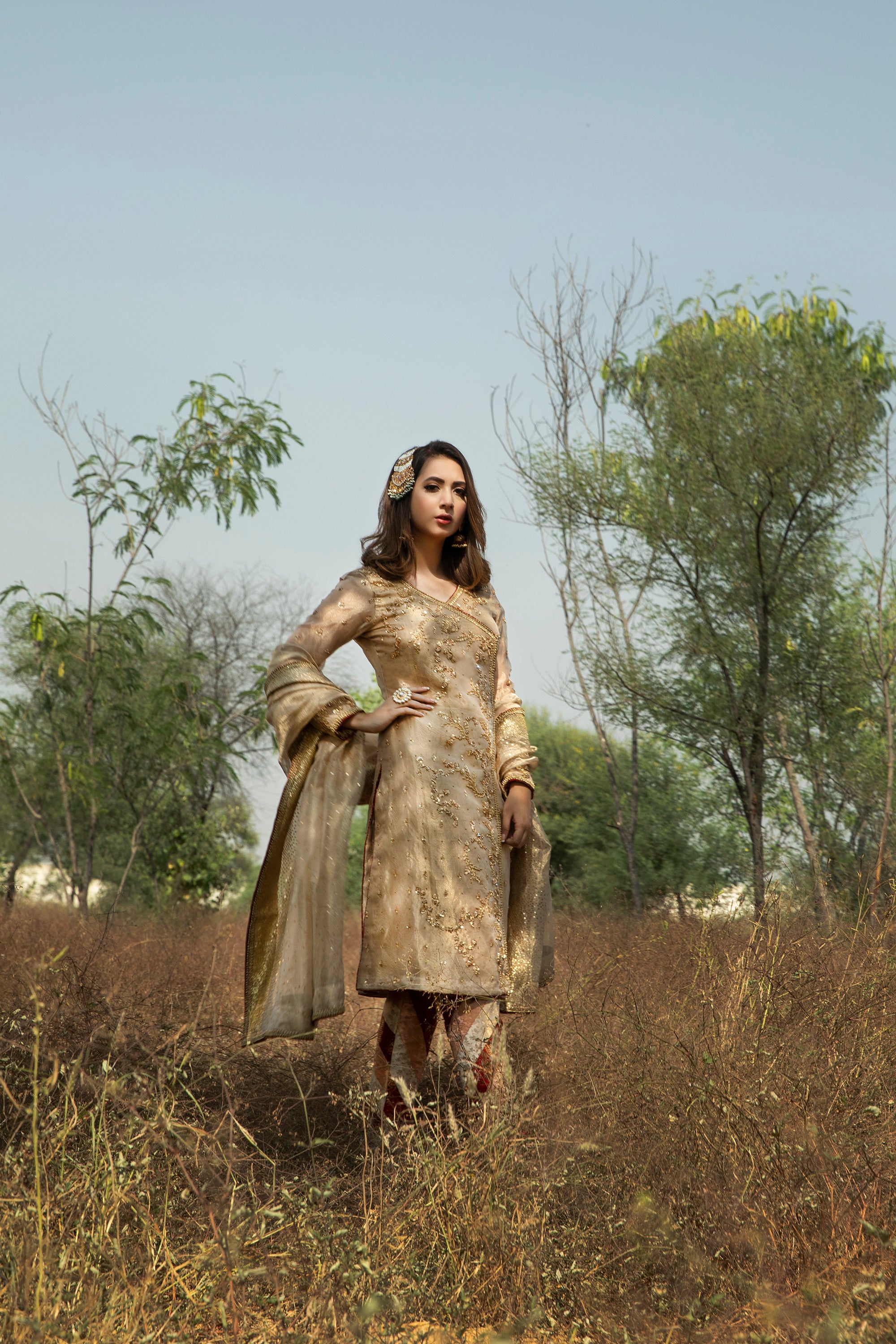 - Versatile Occasion Wear: Perfect for weddings, festive celebrations, or formal gatherings, this Tissue Gold Angarkha Set can be styled for both day and night events. Pair it with statement jewelry and your favorite heels for a stunning look.
