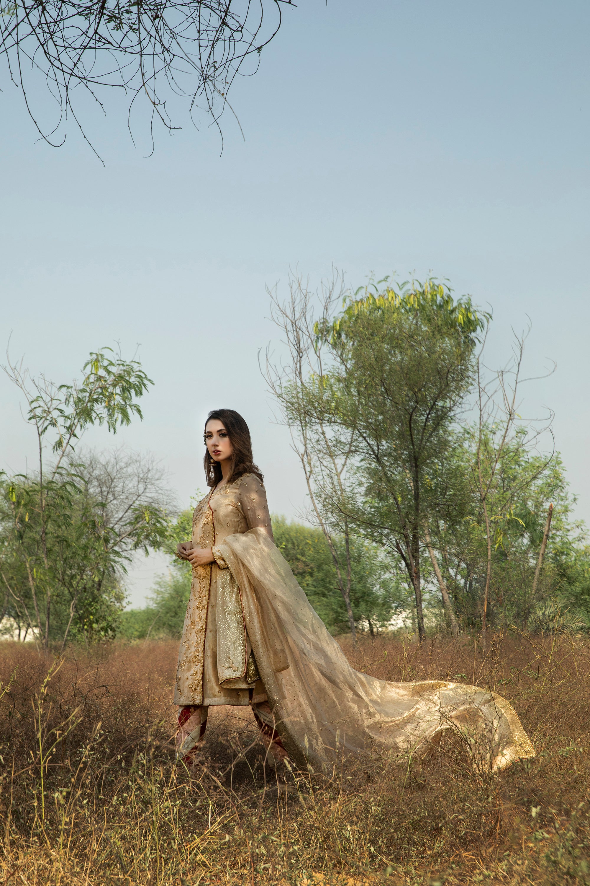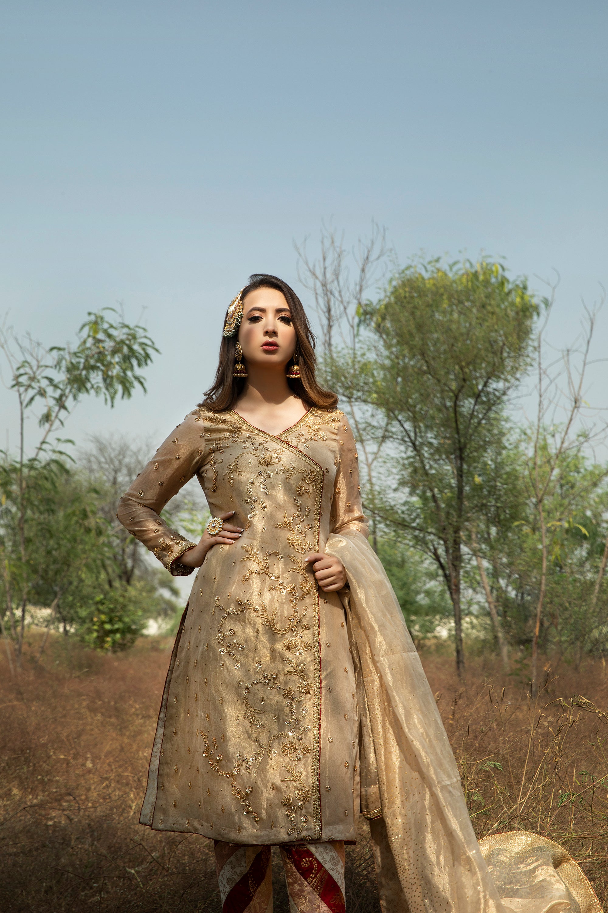 - Angarkha Design: The angarkha boasts a flattering silhouette that drapes gracefully over the body, providing both comfort and style. The rich tissue gold fabric shimmers under the light, offering a radiant glow that enhances your natural beauty.