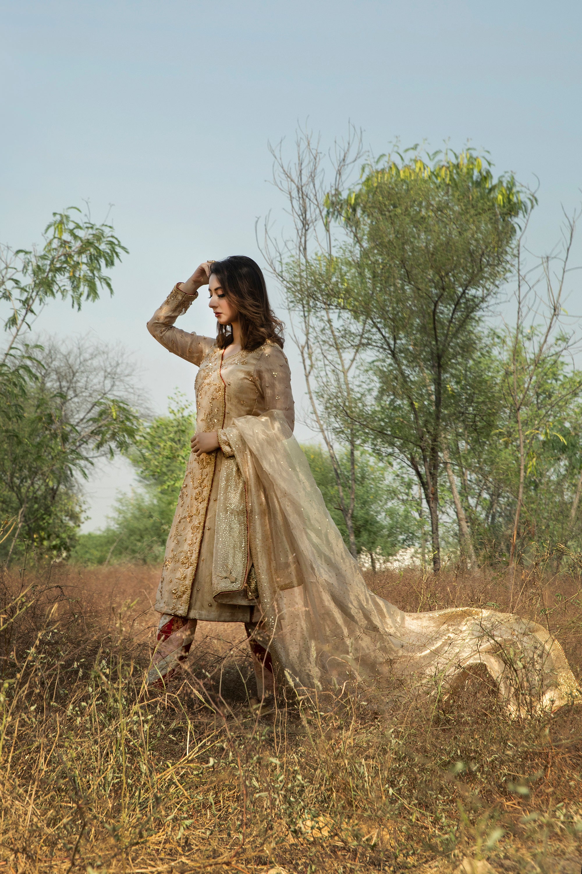 - Tissue Dupatta: The ensemble includes a matching tissue dupatta, which elegantly drapes over the shoulder or can be styled in various ways. The dupatta is adorned with dispersing sequins handwork that sparkles beautifully, adding a touch of glamour to your outfit.