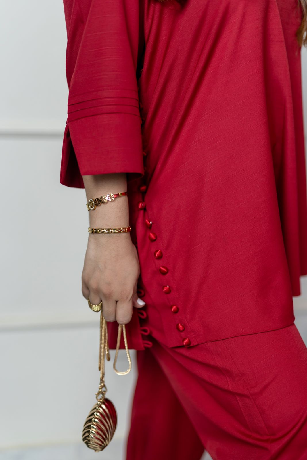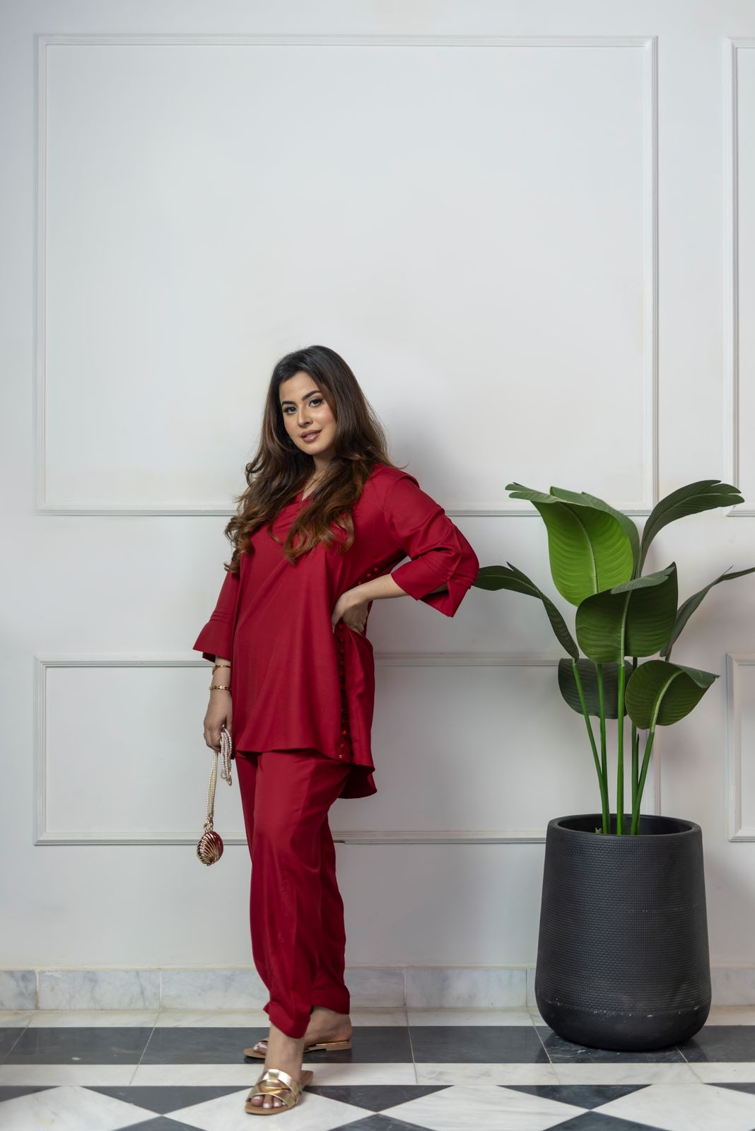 - Elegant Design: The Ruby Radiance Set features sophisticated button details along the side seams, adding a touch of unique flair and visual interest that sets it apart from the ordinary.