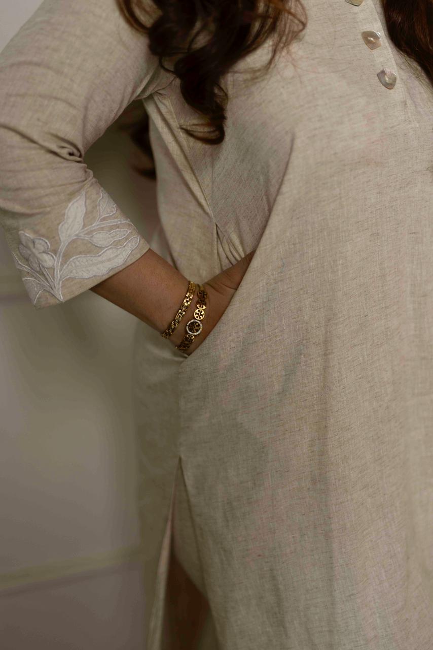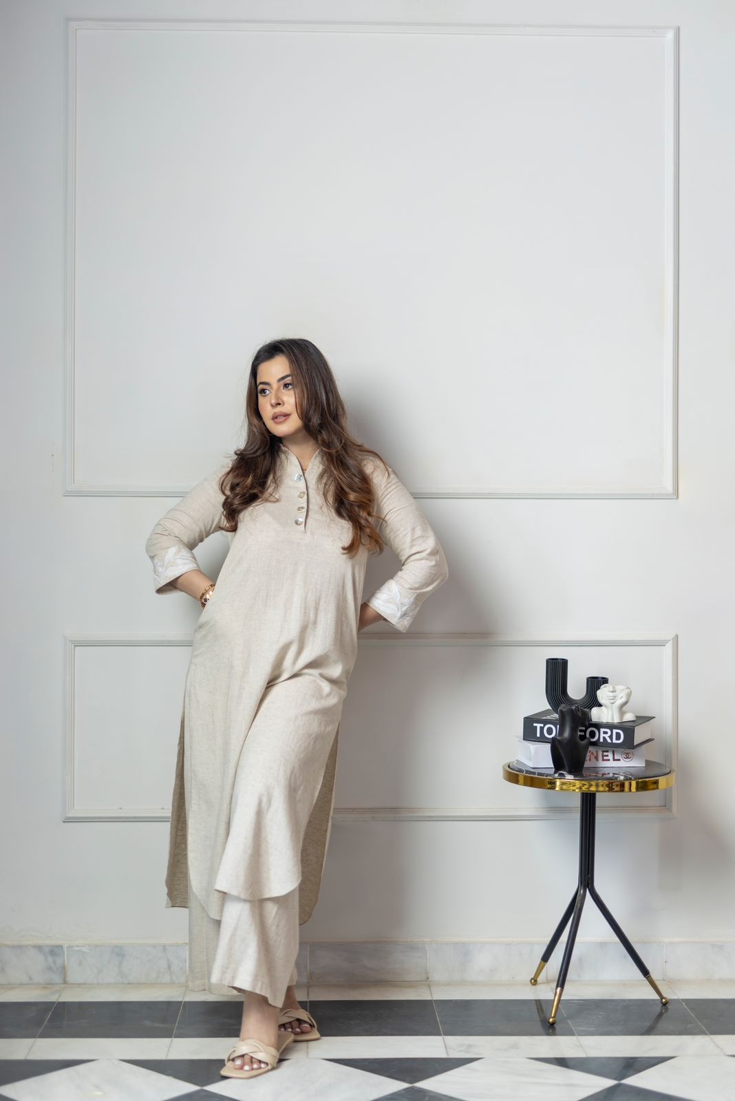 Sandstone Serenade Set - Beige Long Shirt with Embroidered Sleeves