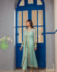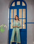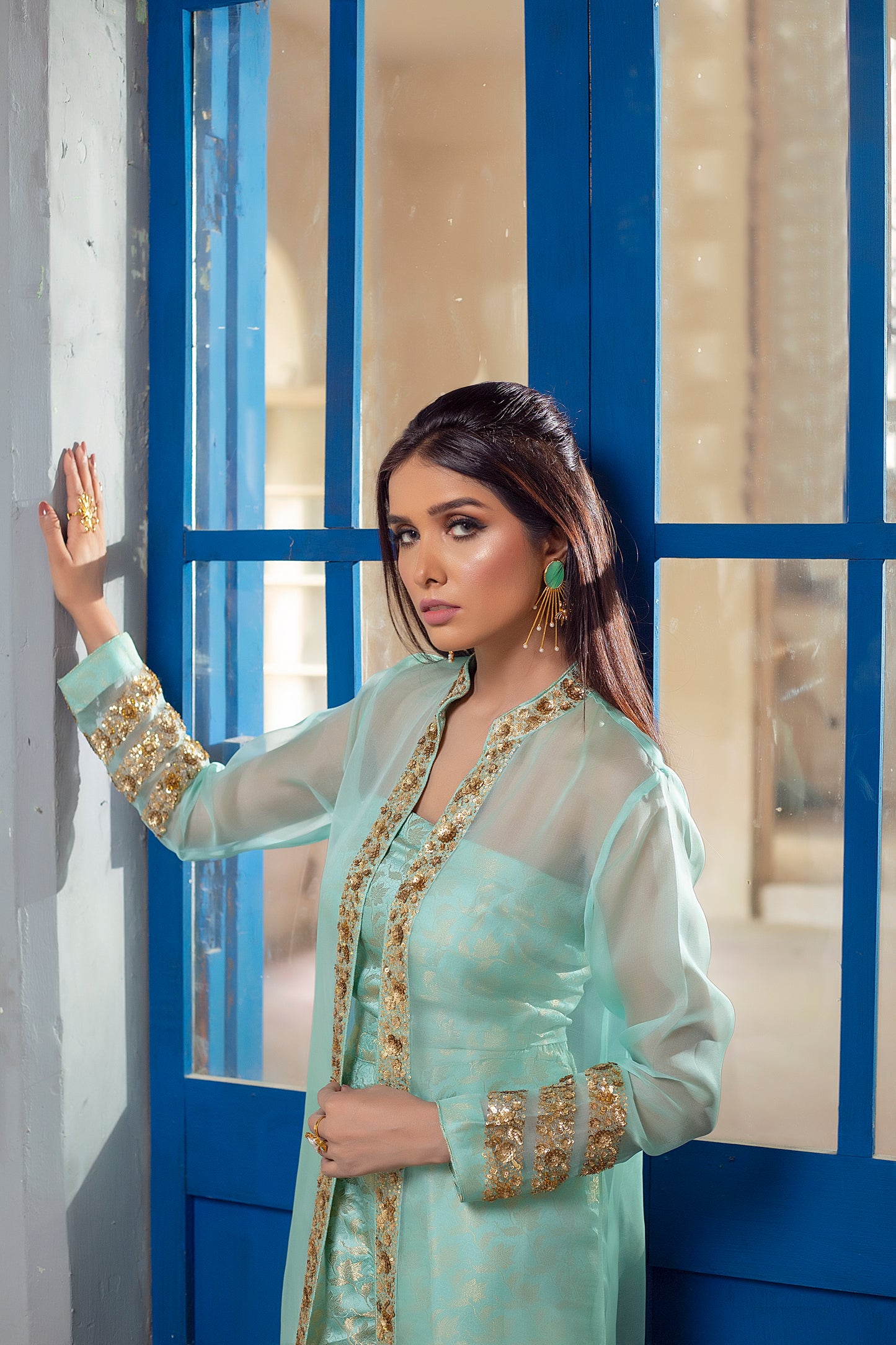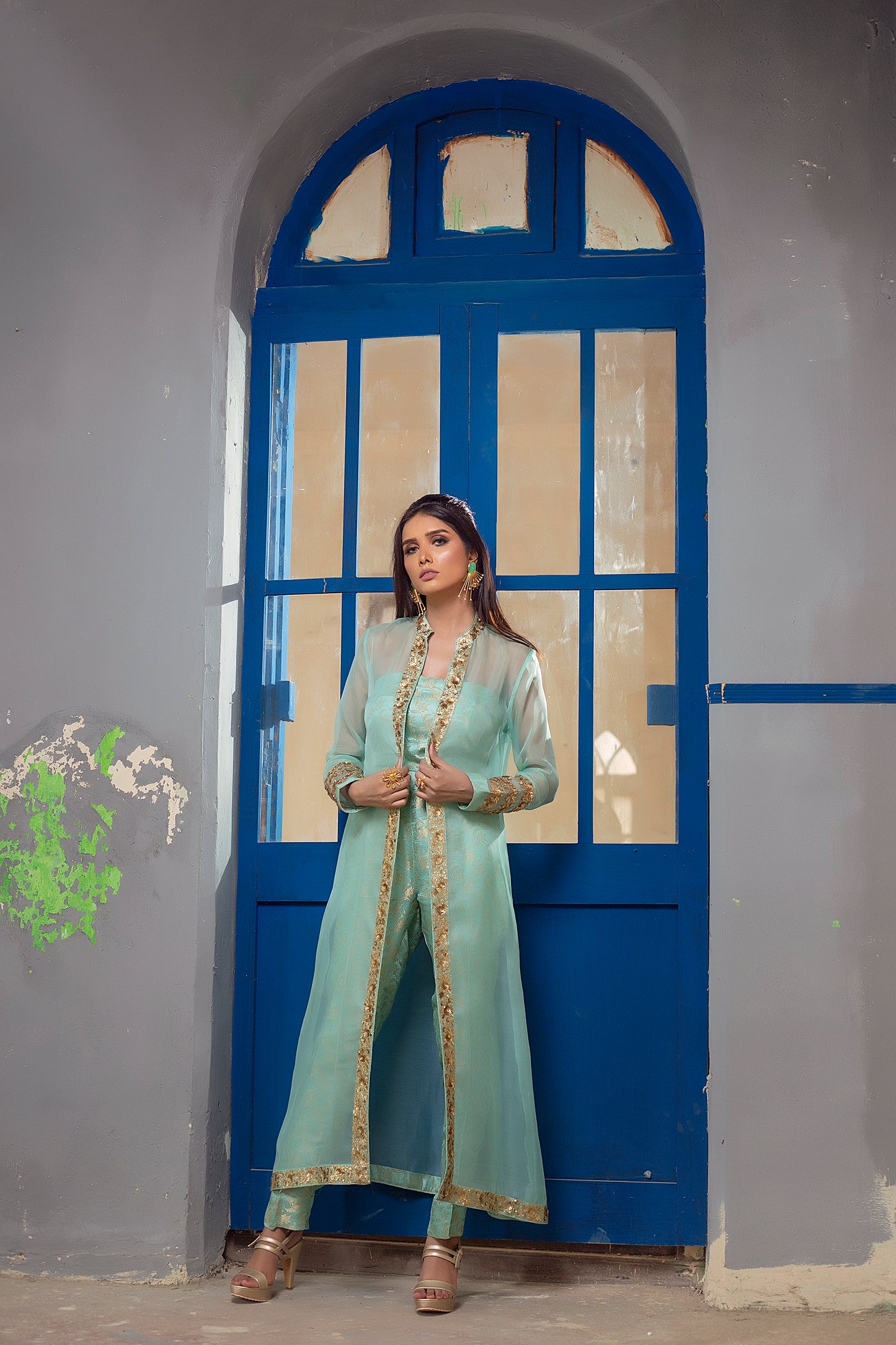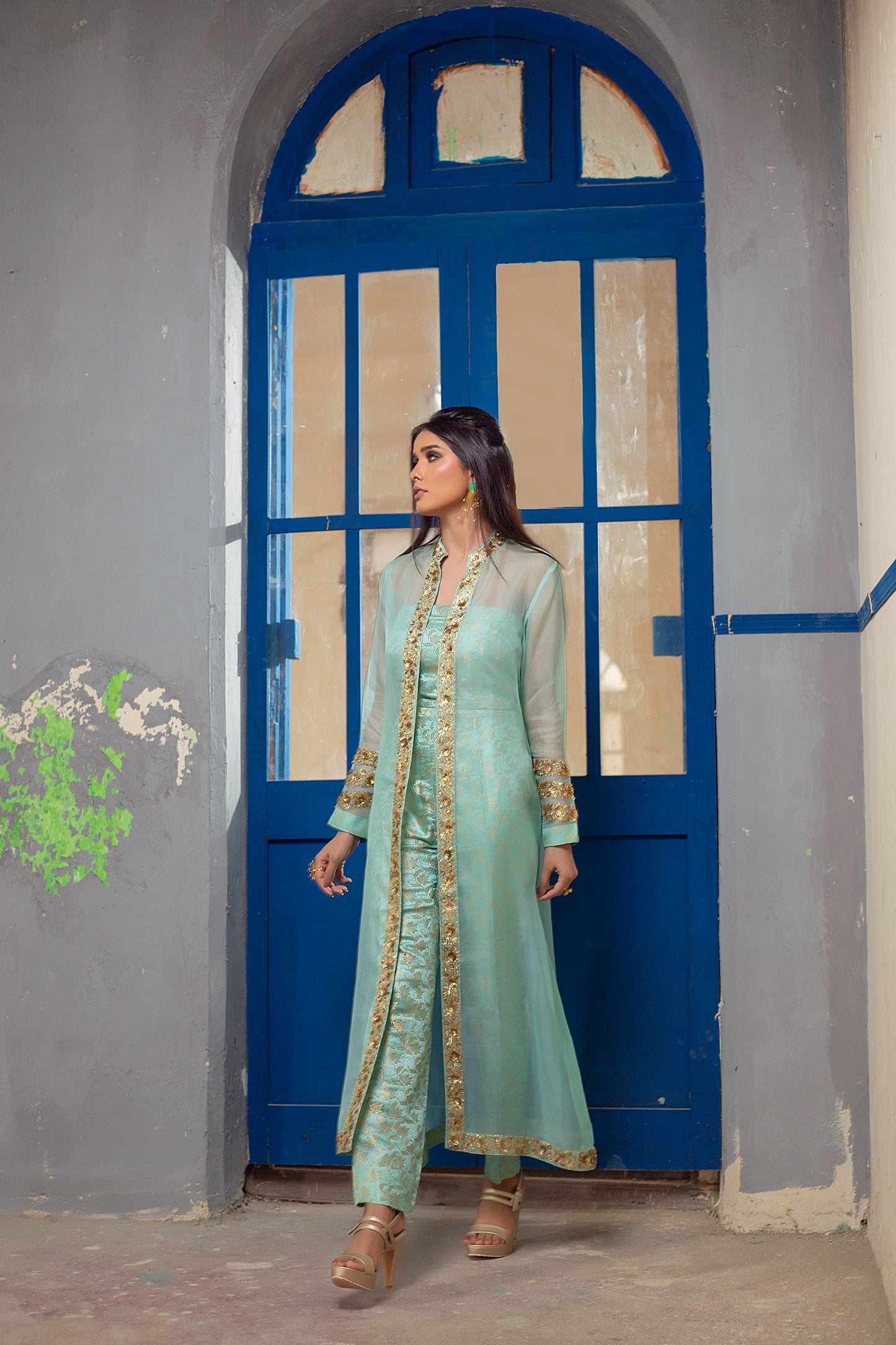To enhance the overall aesthetic, the coat comes with a pure Jamawar blouse and pants. The rich texture of the Jamawar fabric complements the organza coat perfectly, creating a harmonious blend of style and sophistication. Whether paired together for a coordinated ensemble or worn separately to mix and match, this outfit is destined to become a staple in your wardrobe.