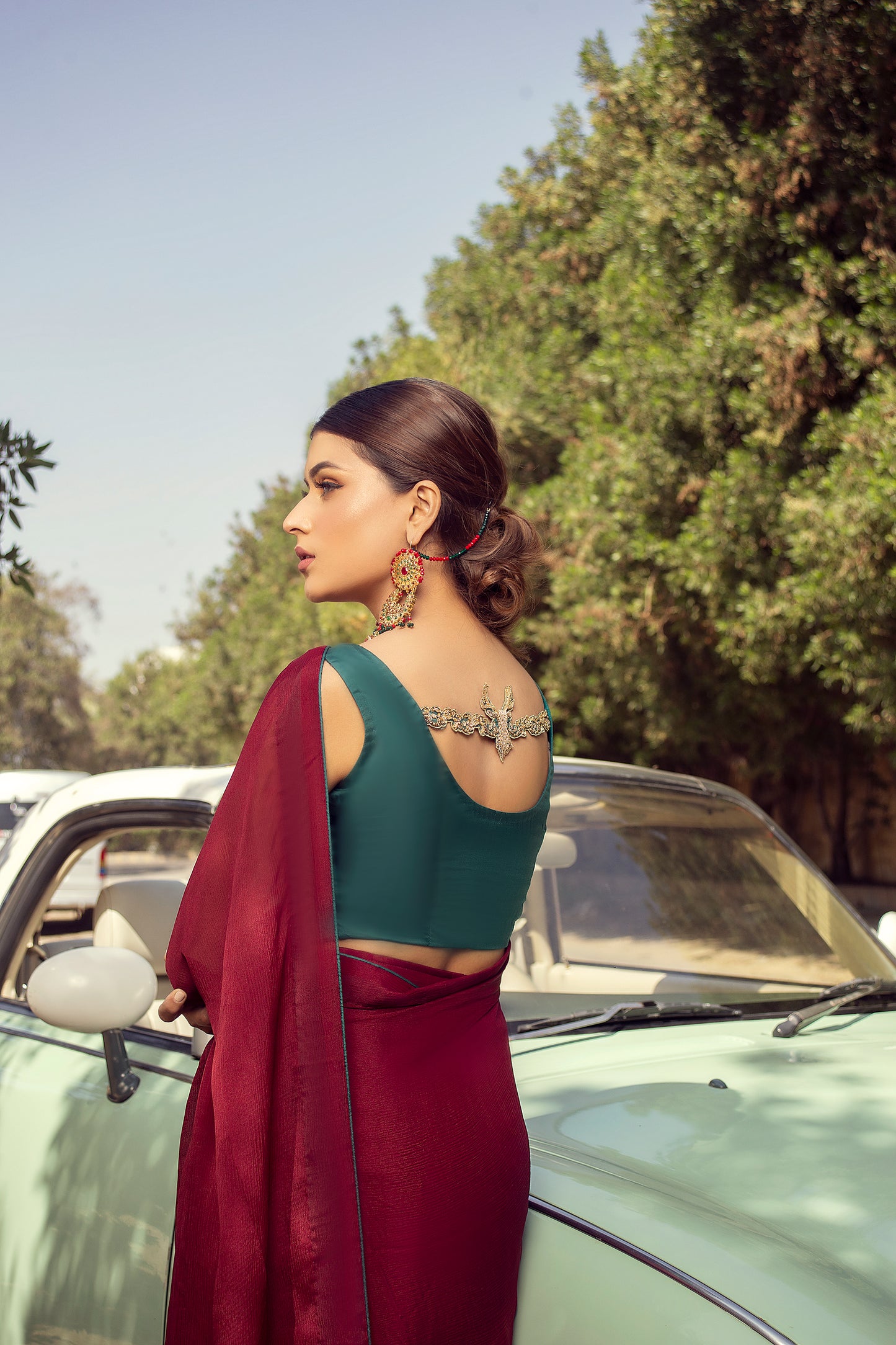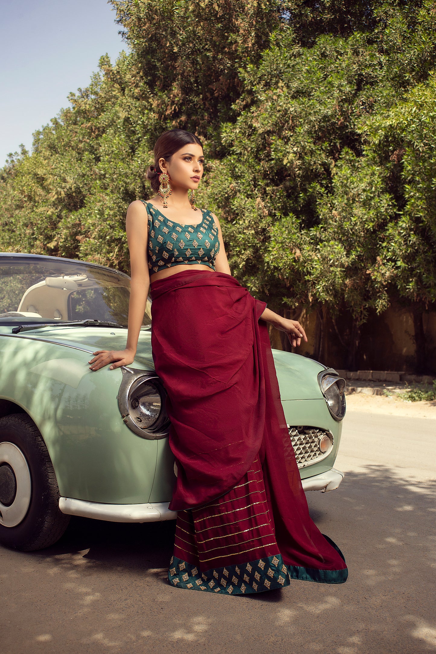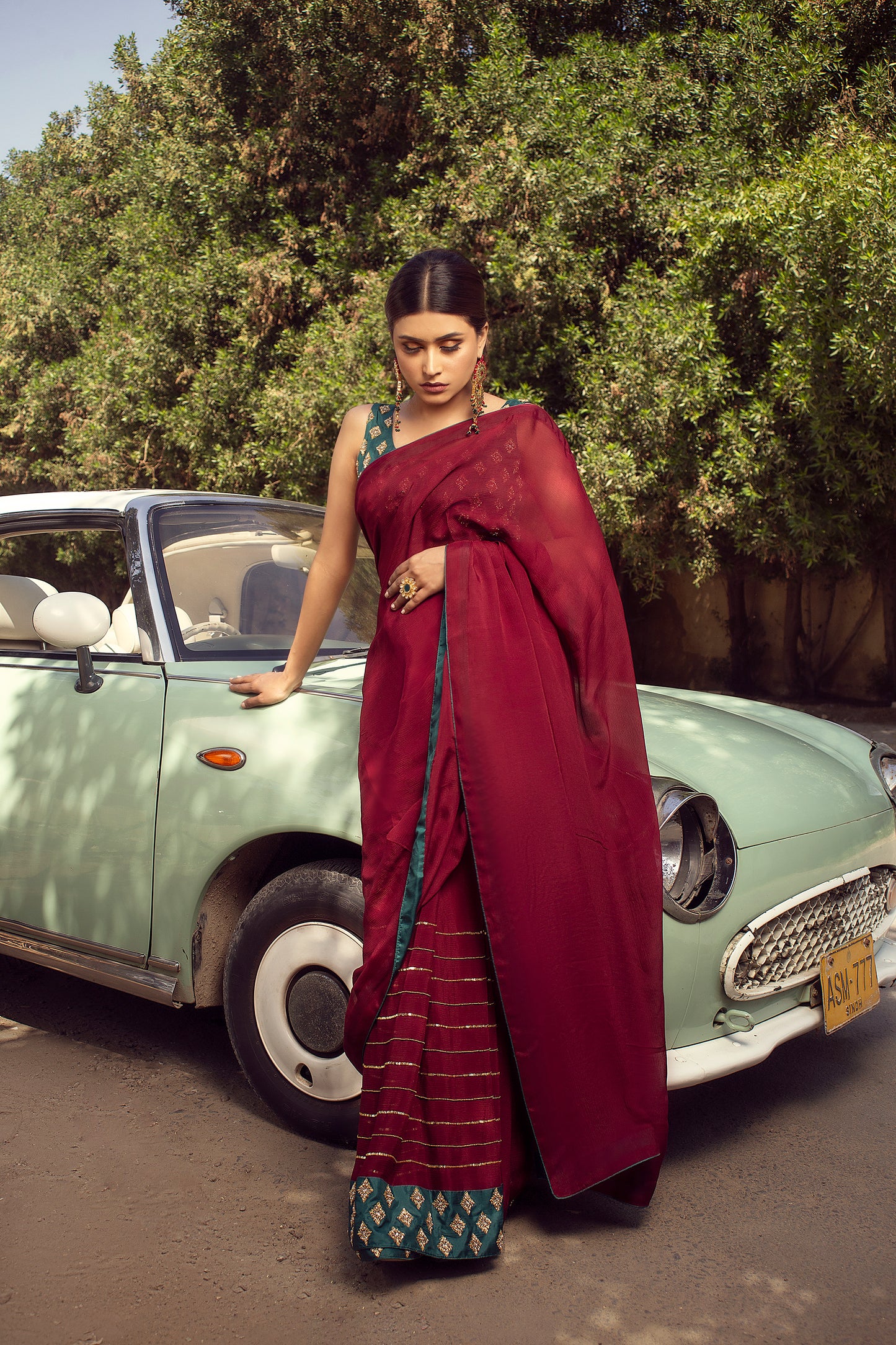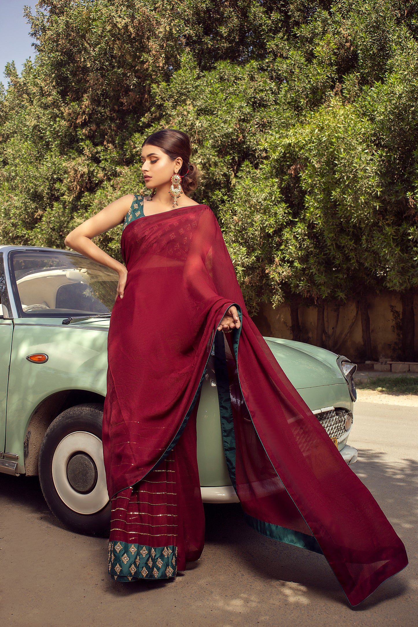 - Garnet maroon chiffon saree paired with a teal green silk blouse, heavily embellished with handwork.